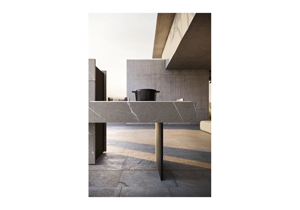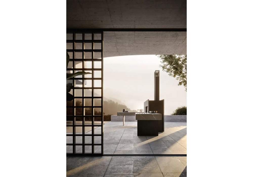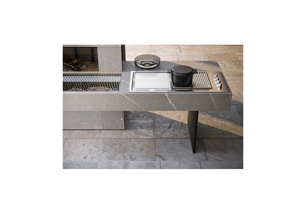 Project 06 diseñado y producido por Modulnova es un sistema de cocina en piedra Flameada Piasentina, compuesto por un bloque de cocina con chimenea derecha en acero inoxidable AISI 316, acabado Epoxi Negro. Cajón de leña extraíble a la derecha. La placa está equipada con barbacoa y cajón de brasas extraíble, placa teppanyaki y placa de inducción. La encimera tiene un lavabo integrado y una nevera. Cada elemento de este sistema se puede realizar en diferentes materiales y acabados, contacta con nuestro Servicio de Atención al Cliente para configurarlo como prefieras.