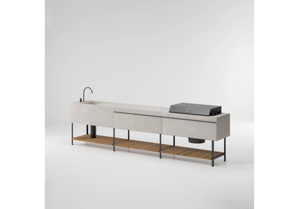 Base Kitchen de Kettal Studio es una cocina modular para exteriores disponible en diferentes configuraciones. Incluye una cocina con fogones de gas, barbacoa, fregadero, encimera y estante inferior de teca. Para una configuración personalizada, póngase en contacto con nuestro servicio de atención al cliente.