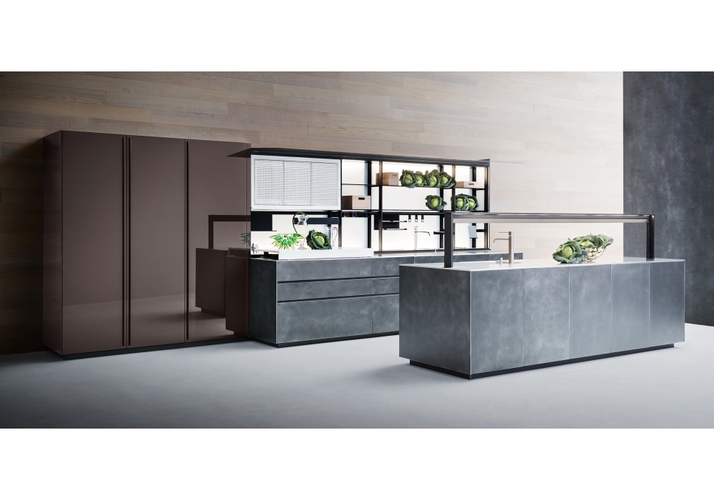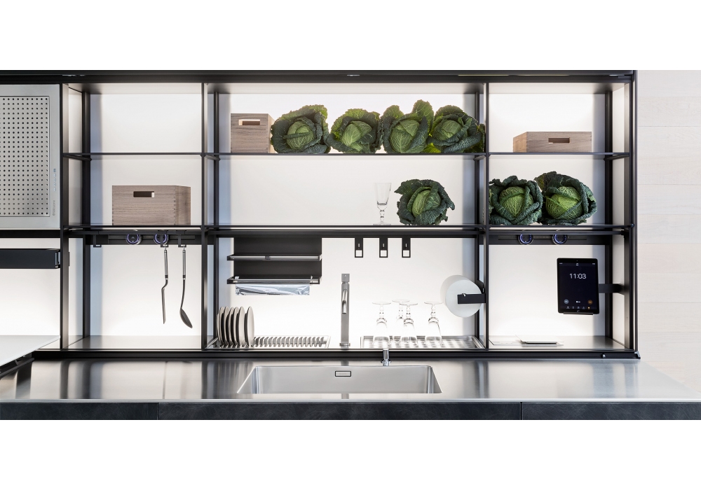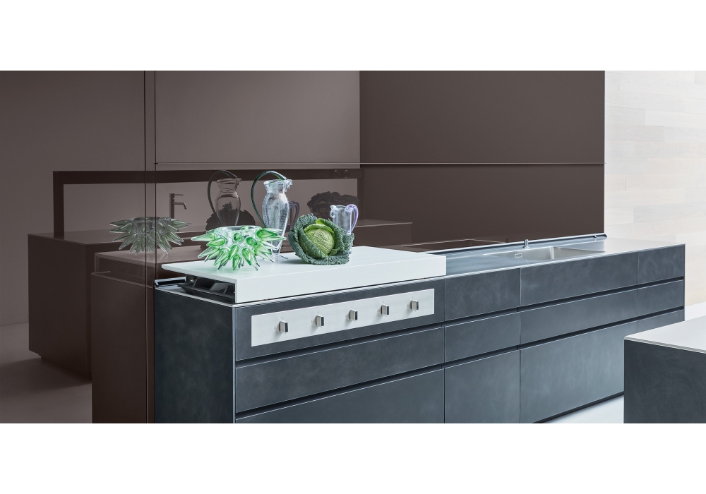 Artematica diseñada por Gabriele Centazzo para Valcucine es una cocina personalizable con diferentes acabados y materiales puros, que abre soluciones y combinaciones infinitas. La parte superior puede ser de tablero de partículas hidrófugo cubierto con chapa de acero, cuarzo, acrílico, piedra, vidrio, acero inoxidable o carbontec. Puertas, unidades de pared y columnas en laminado, panel en Medium Density, MDF, acrílico o vitrum.