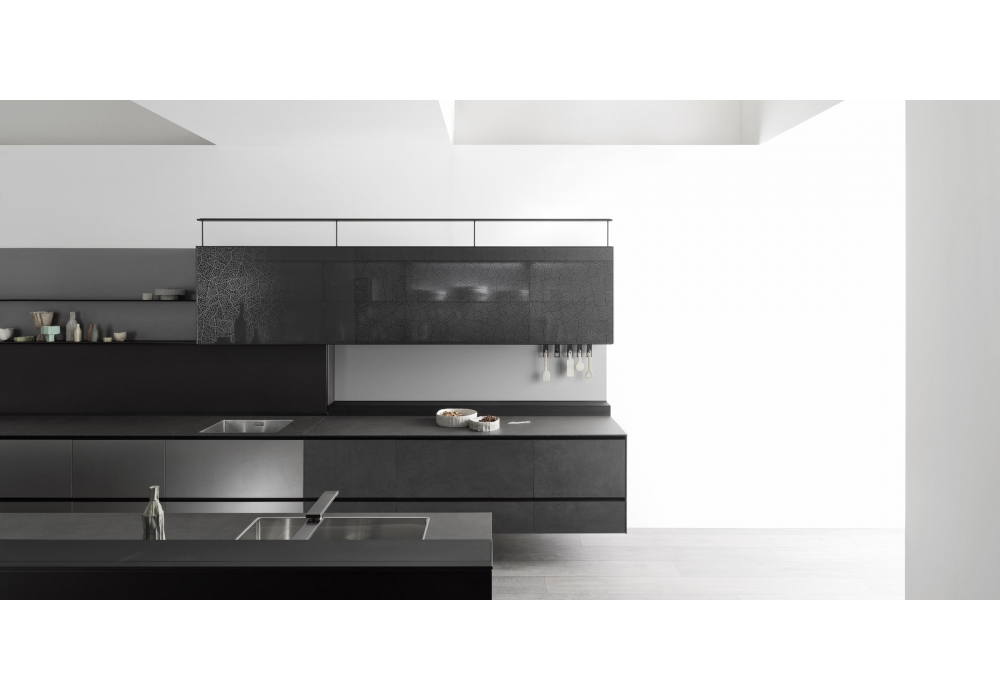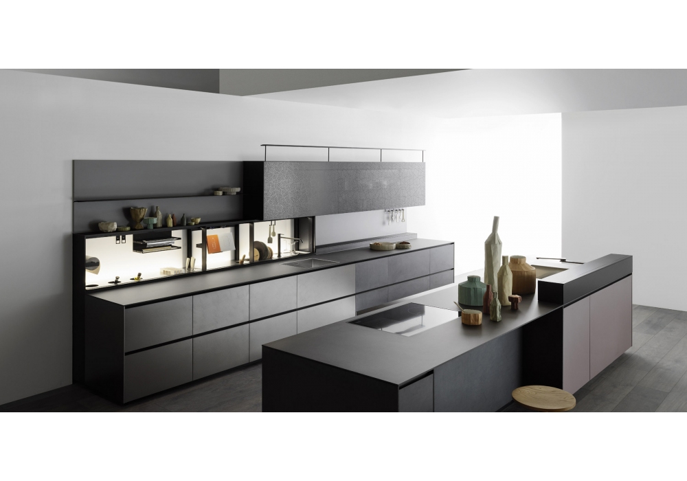 Riciclantica diseñada por Gabriele Centazzo para Valcucine es una cocina con estructura de aluminio, modular y diseñada, incluso con elementos suspendidos, dando la máxima libertad de composición y movimiento. La parte superior puede ser de tablero de partículas hidrófugo cubierto con chapa de acero, cuarzo, acrílico, piedra, vidrio, acero inoxidable o carbontec. Puertas, unidades de pared y columnas en laminado, aluminio o acero.