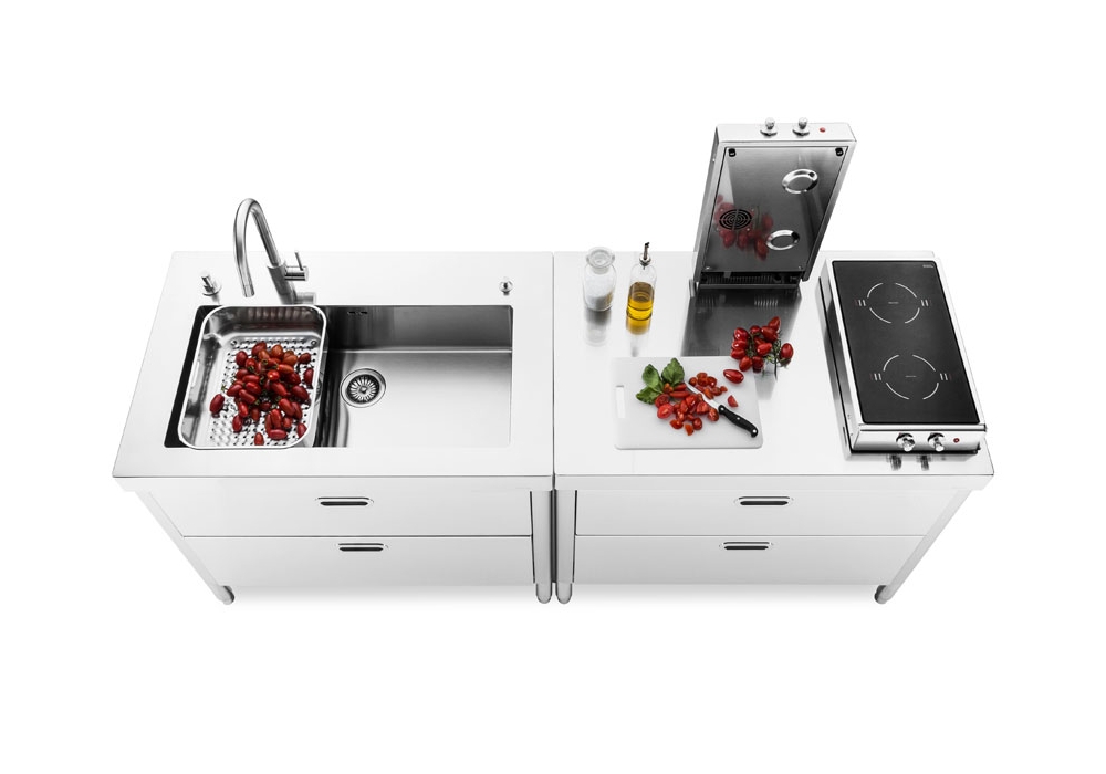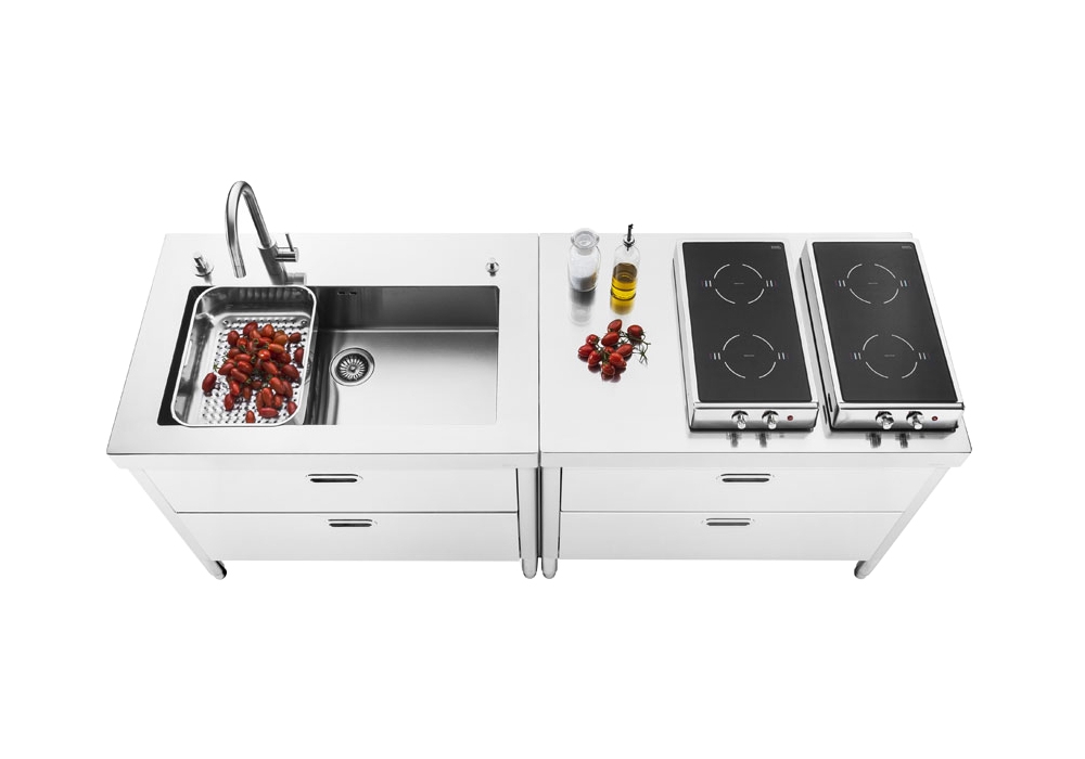 La composición Cocina 100 de Alpes Inox, consta de dos elementos cocina con placas de cocción abatibles de inducción y cubeta integrada.