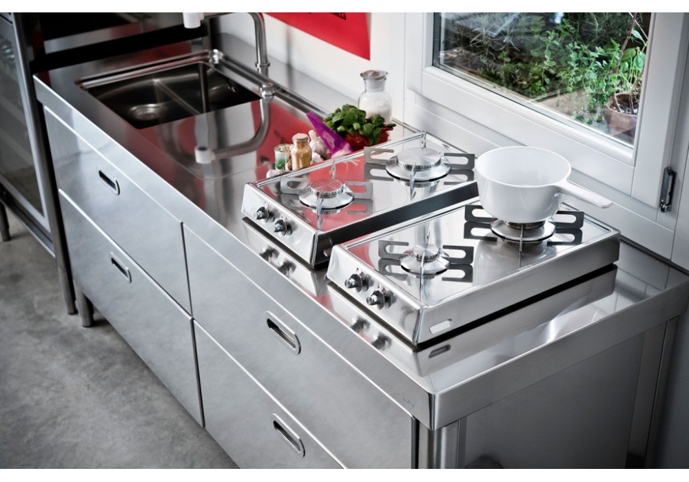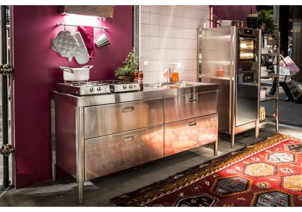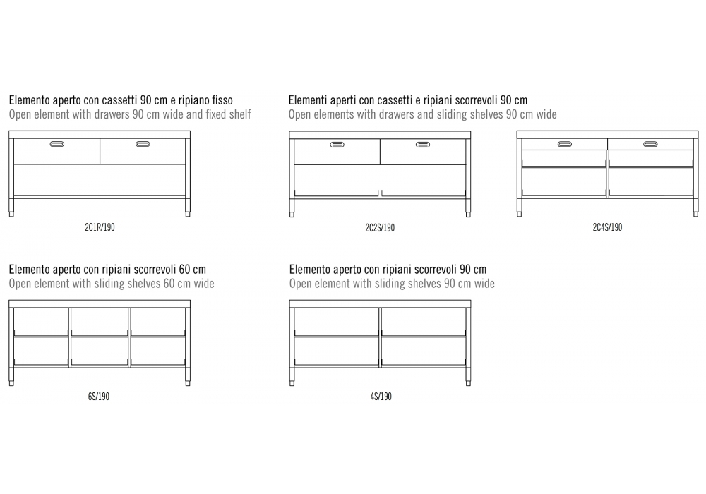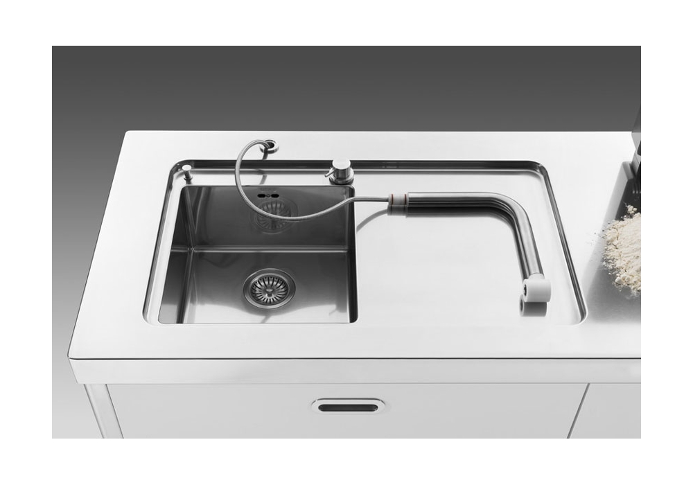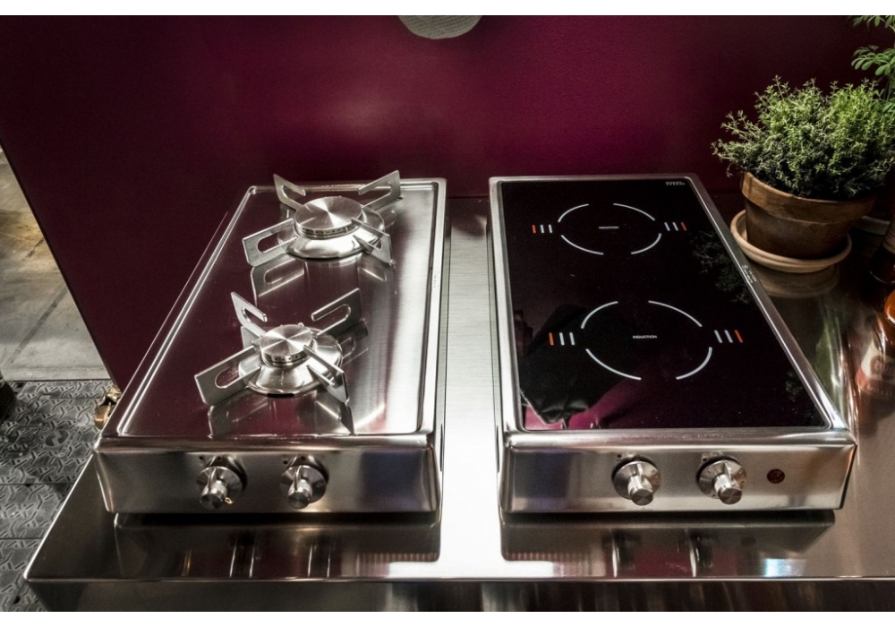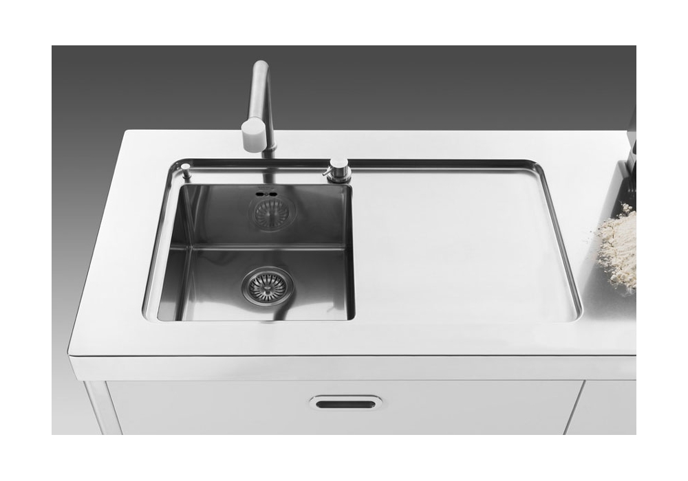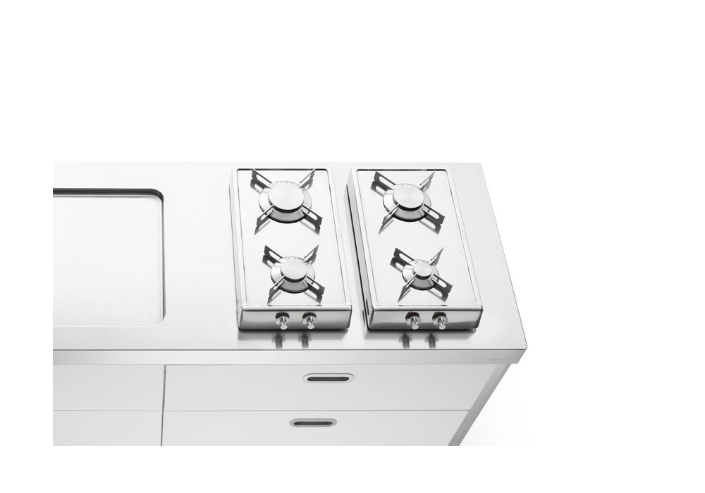 Las Cocinas 190 de Alpes Inox, incluyen elementos cocina de lavado, cocción y almacenamiento, frigorífico y bodega. La parte superior está disponible en diferentes acabados.
