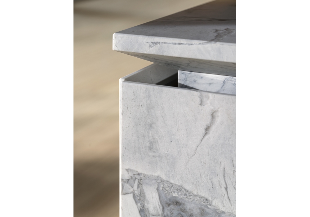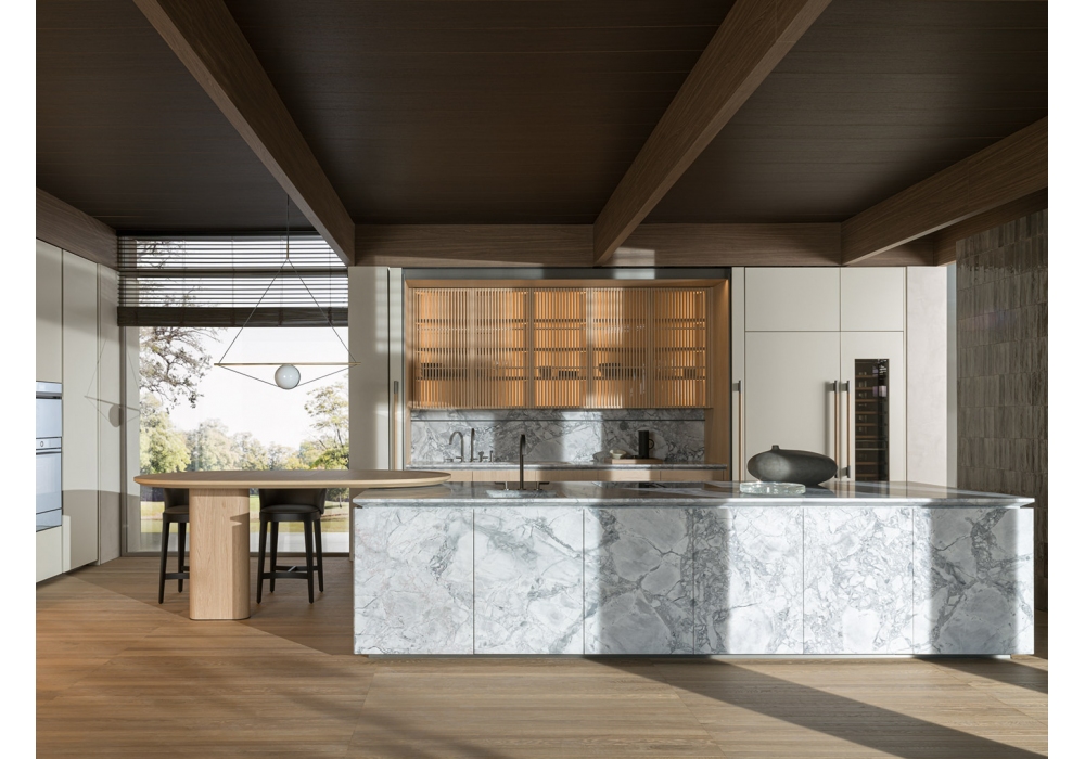 Intersection diseñada por Vincent Van Duysen para Molteni&C es una cocina modular. Este proyecto pasa por la elección de un material adecuado para tal fin, la piedra natural, siempre con las características únicas que le otorga la naturaleza y, en segundo lugar, el uso de tecnologías innovadoras para su elaboración. Como se puede ver en las puertas de los muebles bajos, que se abren sin esfuerzo para garantizar la máxima funcionalidad. Las losas de piedra natural son trabajadas y excavadas con procesos mecánicos de alta precisión, con el fin de aligerar los paneles y asegurar su uso doméstico.