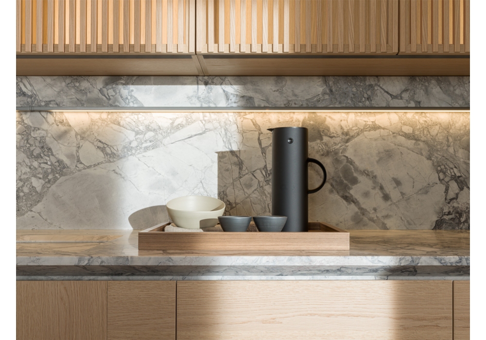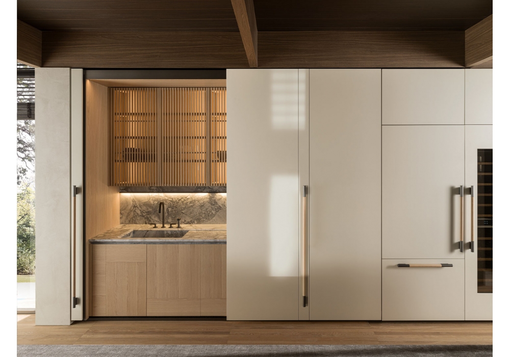 Tivalì 2.0 diseñada por Dante Bonuccelli para Molteni&C es una cocina integrada para todos los espacios, evoluciona con la introducción del nuevo tirador ergonómico de madera maciza Post y la alineación con las columnas Operative 2.0. El concepto que guió el diseño fue disponer la cocina en un espacio útil interno de entre 2,4 y 3 metros. Parece un gran mueble cerrado que a primera vista no revela el contenido. Compuesto por dos grandes puertas correderas plegables que, gracias a sofisticados mecanismos, caen una al lado de la otra en la forma del contenedor. Las puertas de nido de abeja de aluminio alveolar se pueden configurar en los diferentes acabados de la gama.
