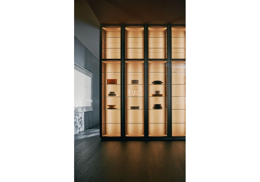 Prime diseñada por Molteni&C es una cocina caracterizada por una apertura con ranura. Se presenta en numerosas variantes compositivas para las necesidades estéticas más sofisticadas. La ranura atraviesa la cocina sin interrupción y termina en las limatesas. La puerta de Prime tiene una forma en la parte superior de 45° para que la apertura sea más fácil y ergonómica. El proyecto también cuenta con la nueva puerta de cristal en acabados bronce y ahumado para los muebles altos y columnas Flair, ambos iluminados con perfiles LED ocultos en los laterales de los módulos, y el nuevo sistema Wing con baldas, en aluminio. El snack Prime completa la composición, con estructura en aluminio titanio y peltre y tapa en la nueva esencia de nogal oscuro.