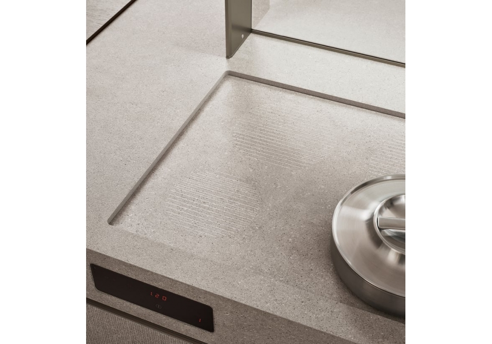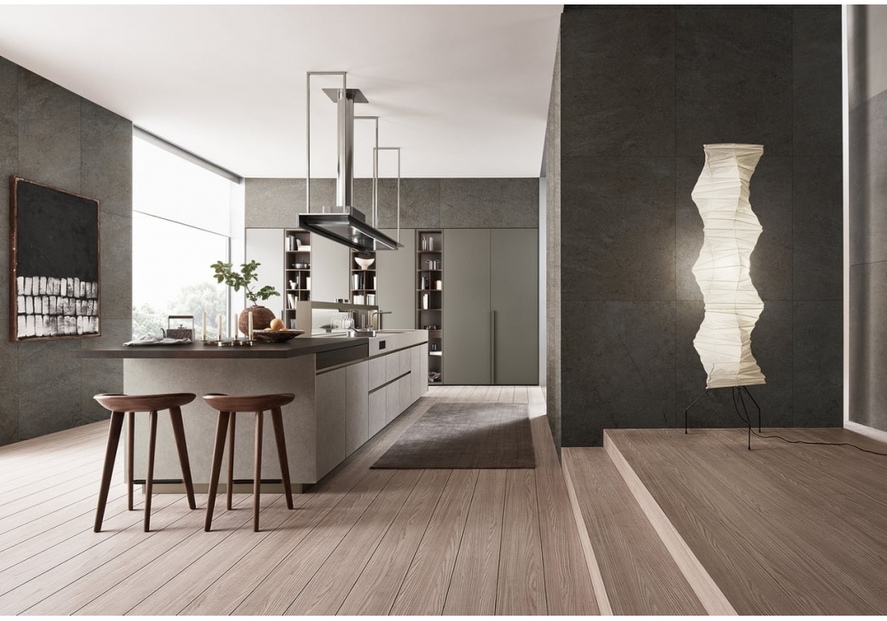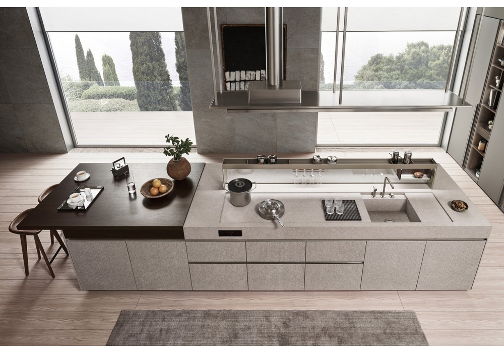 Sign 02 diseñada por Ernestomeda es una cocina compuesta por una isla operativa con compartimentos abiertos, una península deslizante que sirve de zona de snack y preparación. Grandes armarios decoran las paredes y completan el ambiente. El resultado es una cocina informal, caracterizada por una gran atención a los materiales, en una mezcla de colores que crean ambientes elegantes con un fuerte impacto emocional.