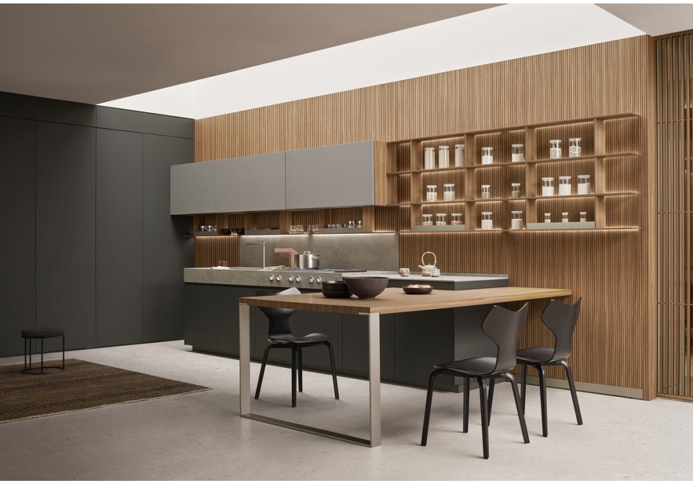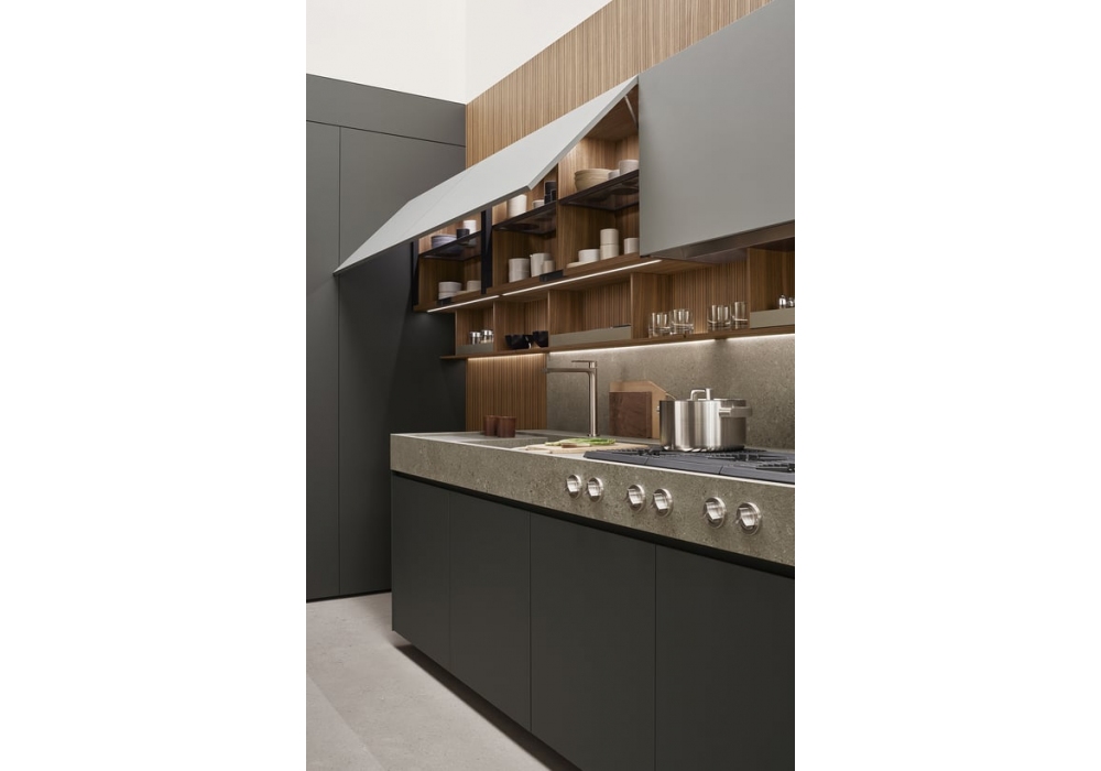 Sign 04 diseñada por Ernestomeda es una cocina. Decora toda la pared apoyándote en la moderna boiserie. La composición que se desarrolla en un solo lado, con la disposición de todos los elementos de la zona de trabajo uno al lado del otro, da una visión inmediata del diseño sofisticado y funcional de Sign.