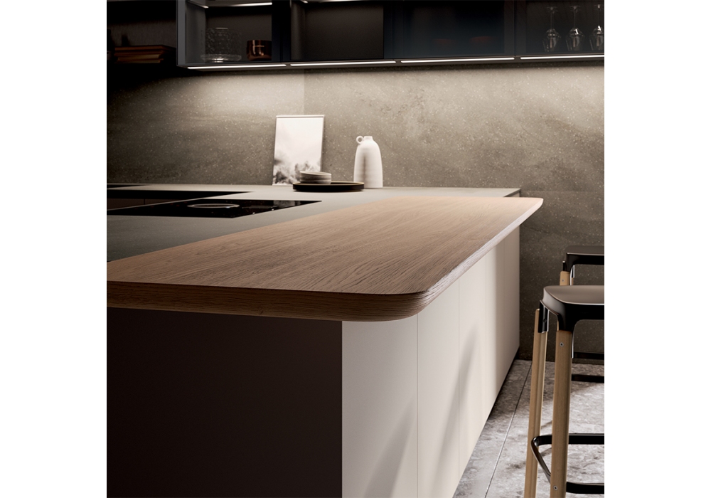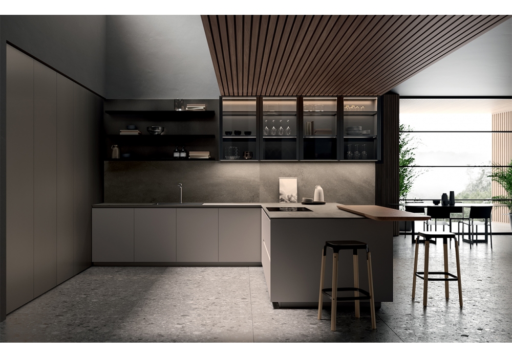 One 03 diseñada por Ernestomeda es una cocina compuesta por muebles altos, estantes y una península que amplía el espacio y hace que la cocina y las áreas de estar se comuniquen: cada detalle de decoración de esta cocina realza el valor material de las superficies al tiempo que ofrece la máxima practicidad.