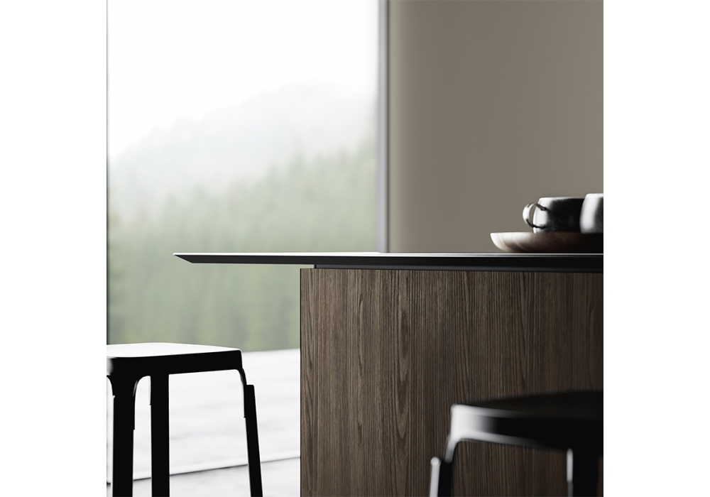 Obliqua 03 diseñada por Ernestomeda es una cocina enriquecida por estantes Clever y Order, el nicho operativo dialoga con la isla compacta y funcional. Encimera de muebles bajos enchapados en roble termotratado y melamina Midland.