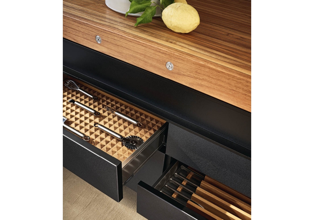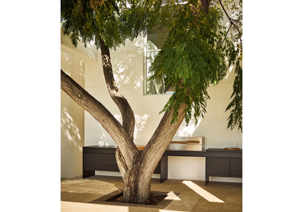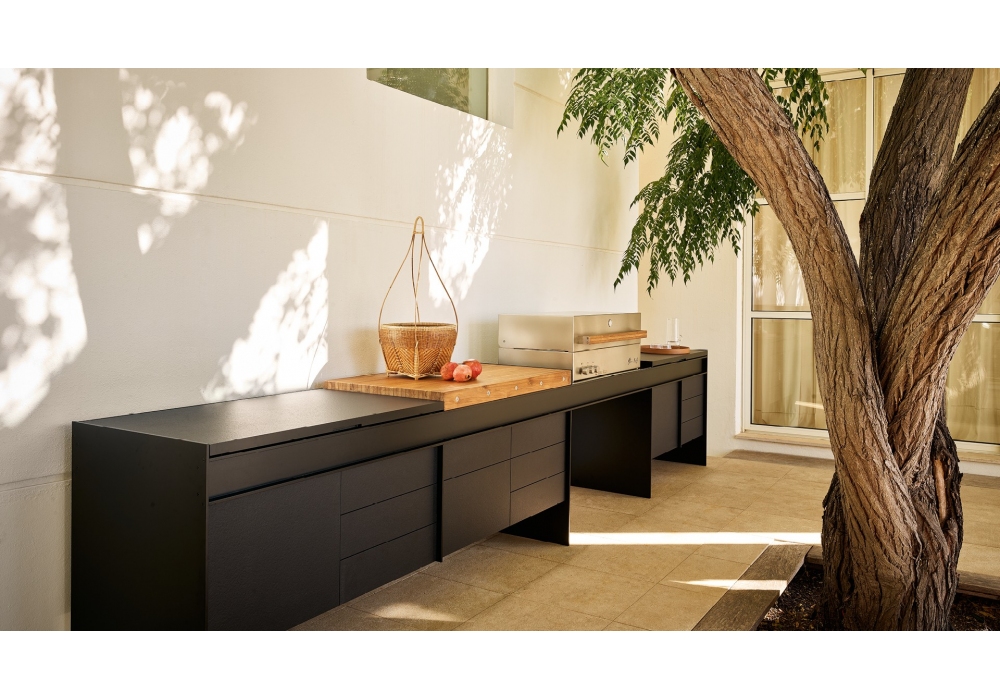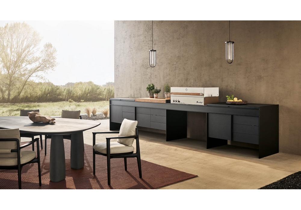 Land diseñada por R&D Poliform y Cap es una cocina de exterior, que se compone de una serie de módulos enganchados a vigas longitudinales que la hacen parecer suspendida. Disponible en dos versiones de pared o de pie, y fabricado en aluminio, Inalco MDi® y acero, materiales aptos para exteriores. No requiere ninguna conexión eléctrica, ya que todas las funciones son a gas oa pilas, y está equipada con fregadero, tabla de cortar y barbacoa.