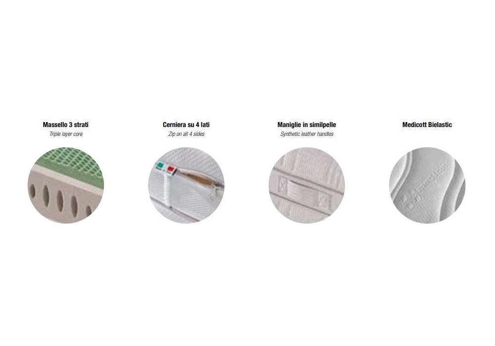 Suprema Memory Medicott® diseñado y producido por Twils es un colchón con madera maciza de 3 capas, 7 zonas Aquatech y una superficie en Soy Memory. Forro exterior desmontable en tejido Medicott Bielastic. Cremallera en los 4 lados y asas de piel sintética. Disponible en varios tamaños. 23 cm de altura.