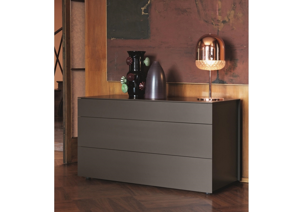 Juta diseñada por Pinuccio Borgonovo para Flou es una cajonera con superficie anti arañazos (Style, Epoque, River, Private,Saffiano con borde de roble teñido gris) o lacada mate en los siguientes colores: blanco, arena, bronce, gris oscuro, cuerda, plomo, greige.