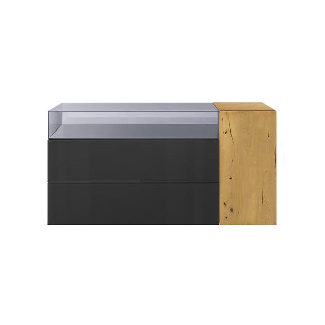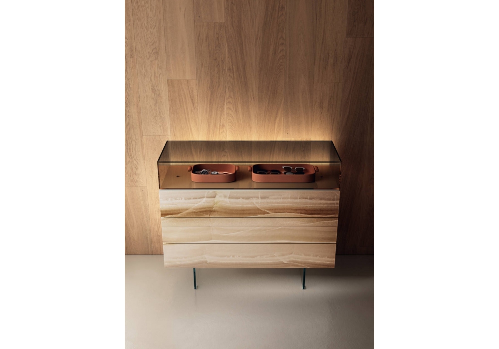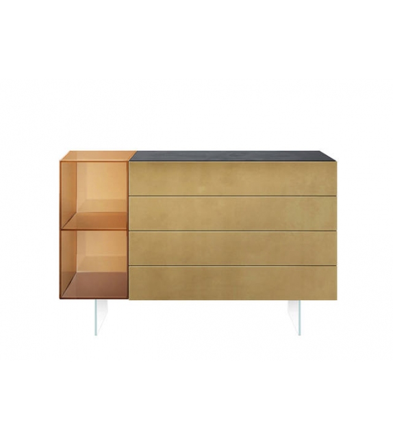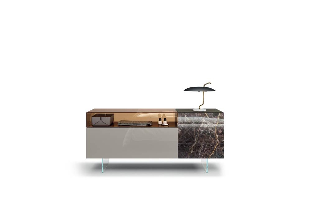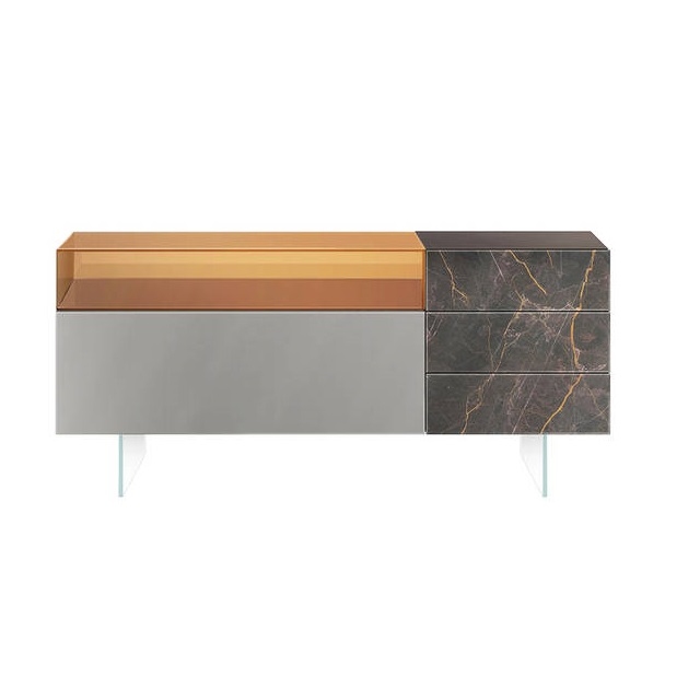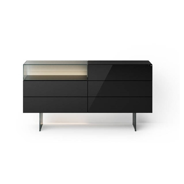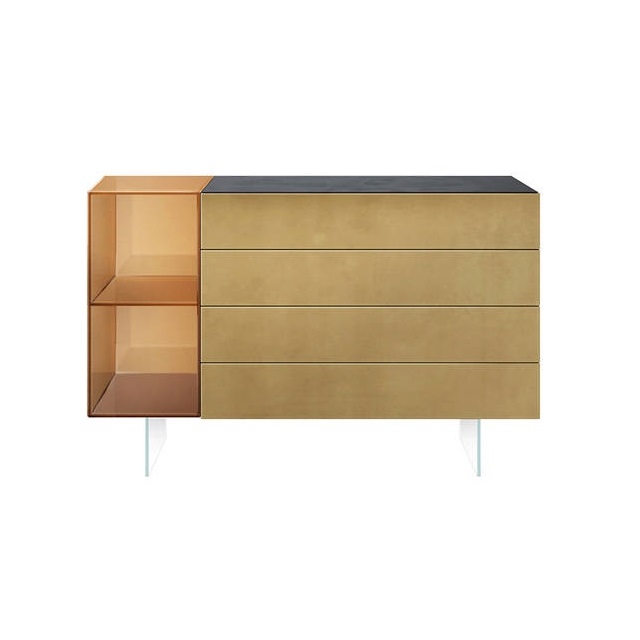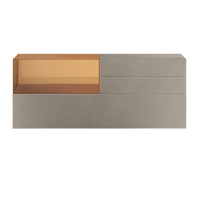 36e8 diseñada por Daniele Lago es una cómoda disponible en diferentes modelos. Entre los materiales utilizados se encuentran: madera Wildwood, madera lacada, vidrio y vidrio xglass. Disponible con patas en cristal templado, con patas o fijadas a la pared.