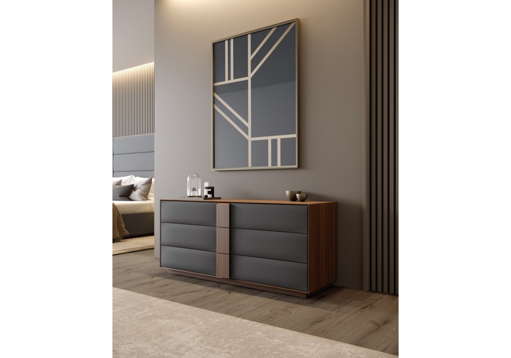 Amazon diseñada por Christophe de Sousa para Gual Design es una cajonera con estructura enchapada en nogal y frentes de cajón revestidos en diferentes tejidos. Hay un divisor interno para cada cajón.