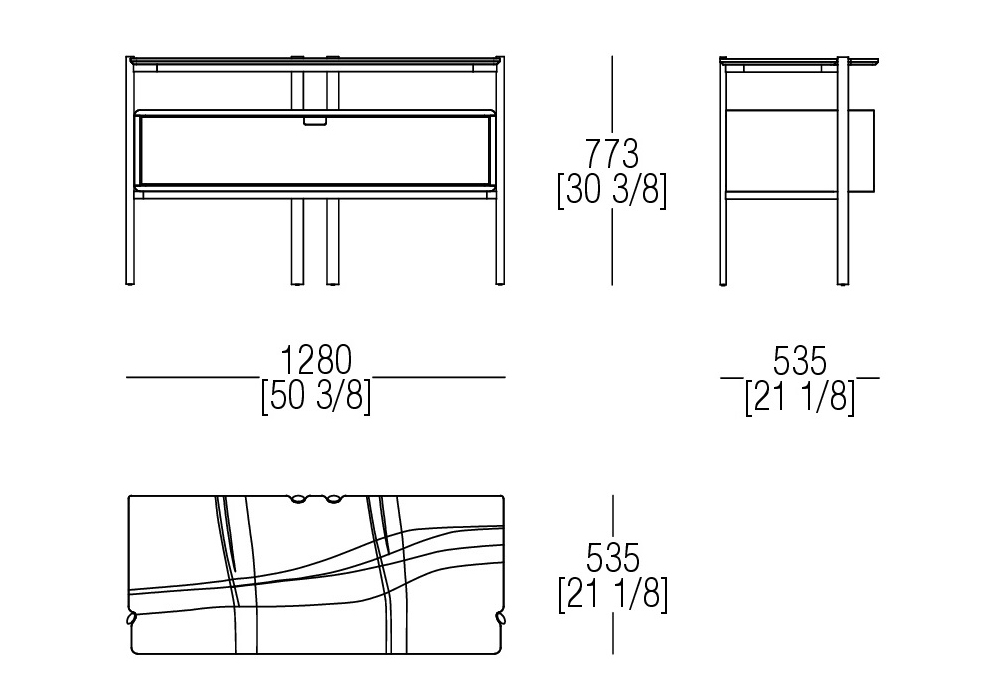 Eros diseñada por Studio 63 para MisuraEmme es una cajonera realizada con estructura de metal pintado bronce, contenedor de roble negro y tapa de mármol.