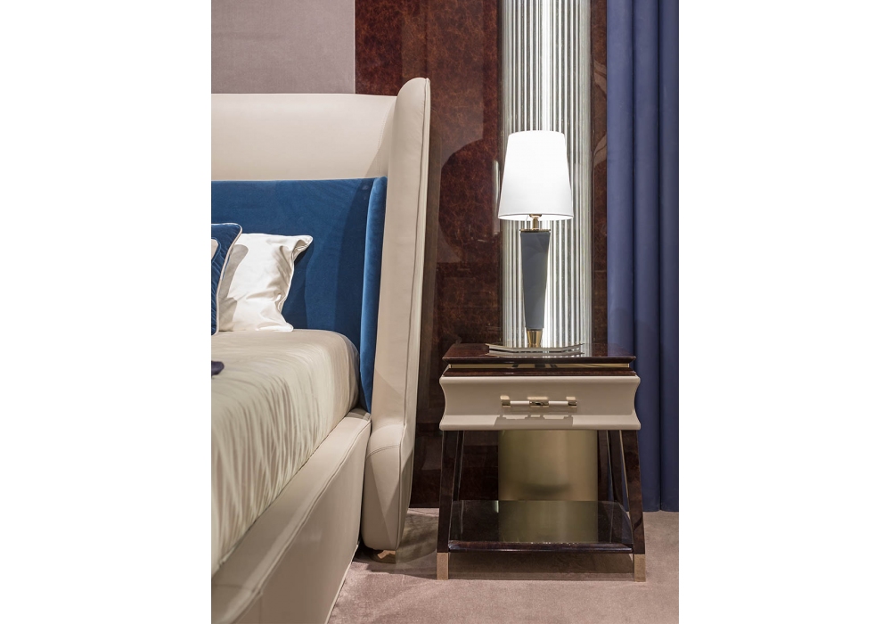 Noir diseñada por Andrea Bonini para Turri es una mesilla de noche con estructura en MDF y paneles de aglomerado en acabado lacado brillo, revestimiento en piel y tablero en mármol o madera. Hay un cajón con revestimiento interior en microfibra. Pies y partes metálicas en diferentes acabados.
