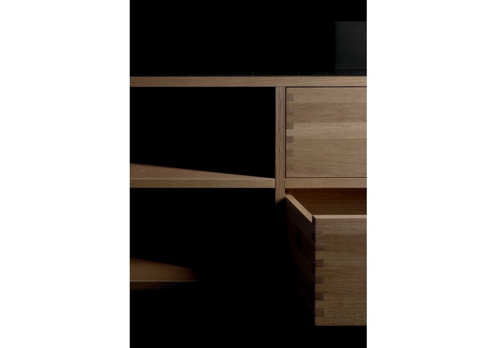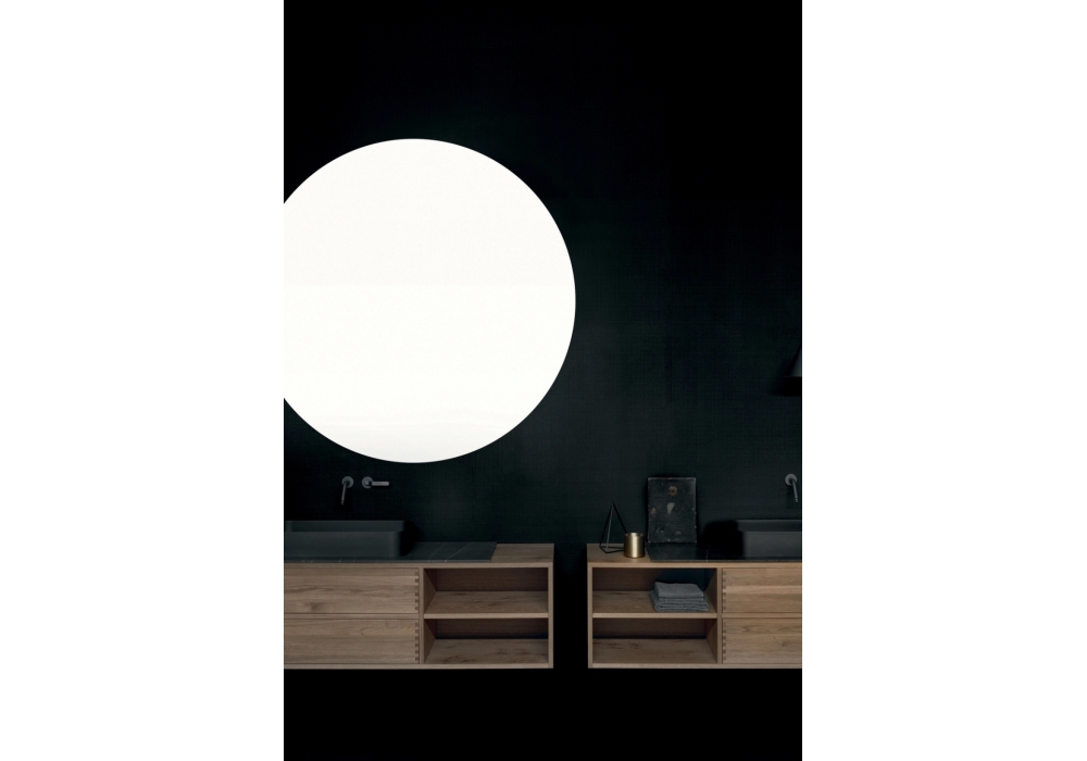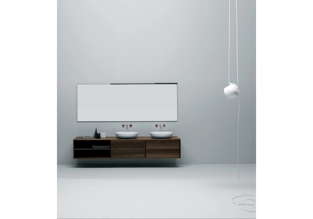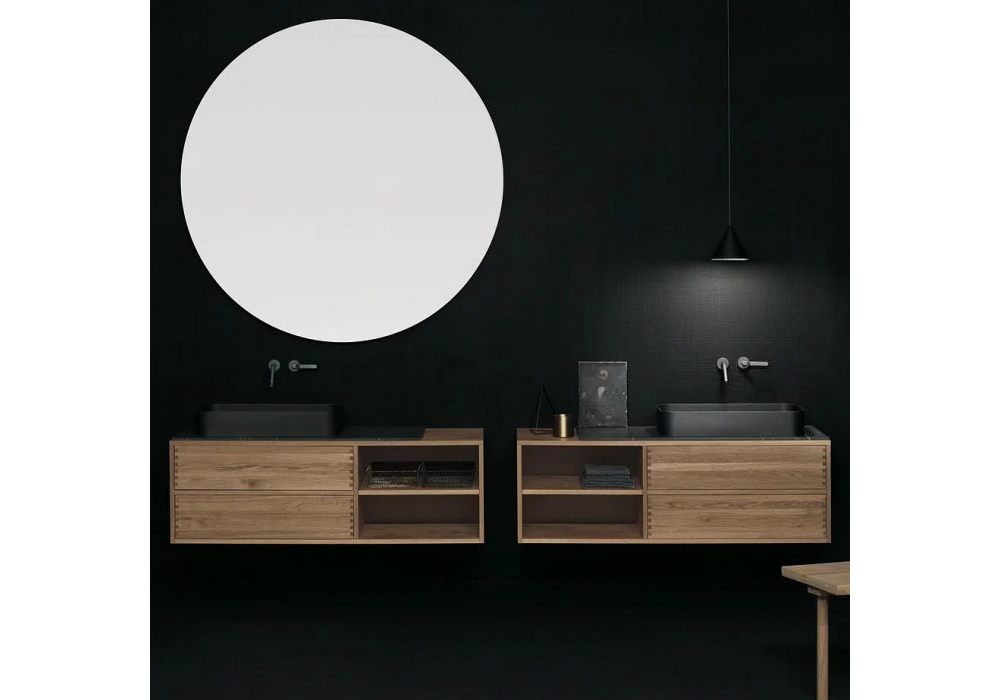 Wood-In diseñado por Piero Lissoni Para Boffi es un mueble de baño de madera compuesto por monobloque con cajones o compartimentos abiertos. Disponible en diferentes acabados.