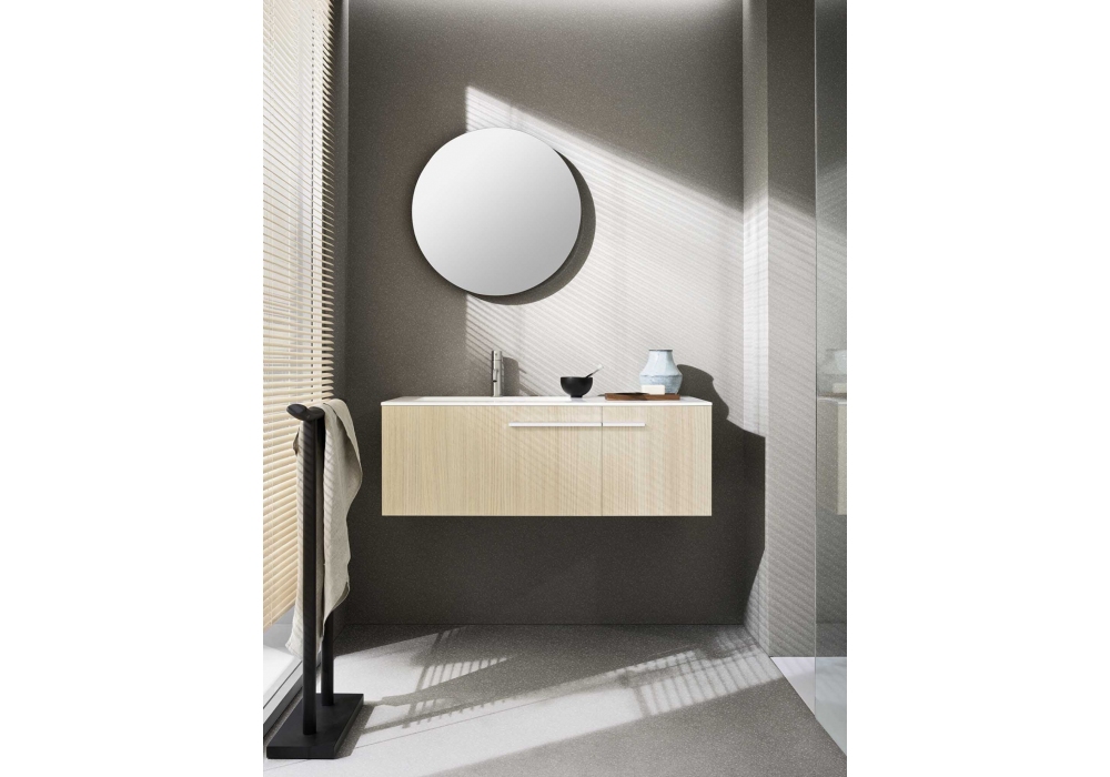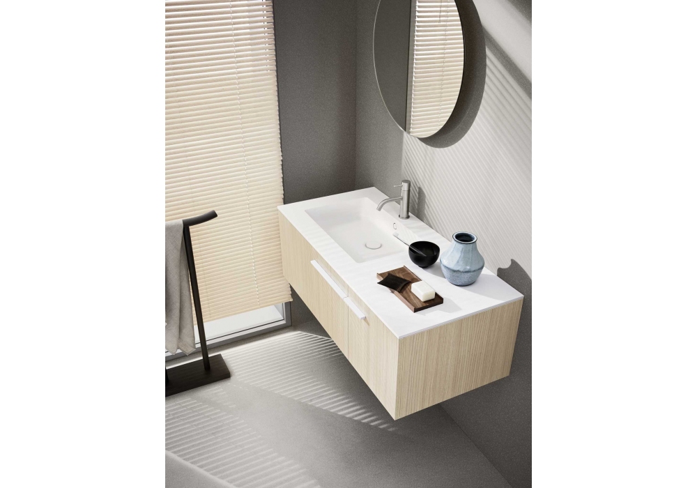 One 19.01 diseñado por CR Noorth para Noorth es un sistema de baño realizado con lavabo encastrado, base en melamina vainilla veteada, tirador lacado blanco mate, toallero de suelo de roble carbono, grifo de acero inoxidable satinado.