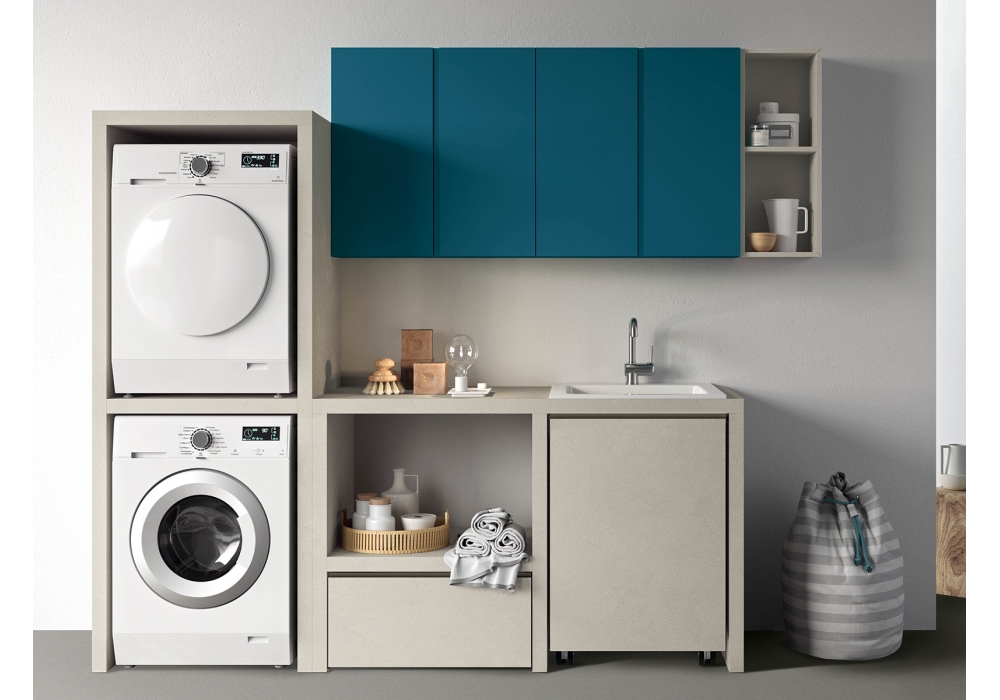 Idrobox diseñado por Birex es un armario de lavandería formado por elementos abiertos con cestos y módulo de lavadora y secadora en acabado perla texturizado. Muebles altos lacados en azul océano mate y elemento abierto con cesto en acabado perla texturizado.