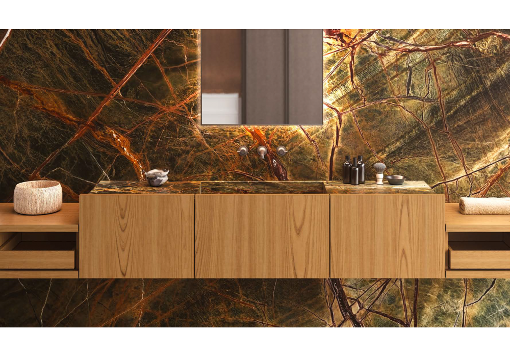 Framis diseñado por Vincent Van Duysen para Molteni&C es un sistema de baño caracterizado por la calidez del roble ámbar, que contrasta con el mármol Rain Forest Green utilizado en las encimeras y los lavabos integrados. La unidad base con módulos laterales abiertos crea un juego dinámico de niveles y superficies. Completan el espacio la bañera Ero de piedra volcánica con interior de esmalte verde, el espejo Eidon retroiluminado con marco de peltre y la grifería Flora, para un estilo refinado y contemporáneo.