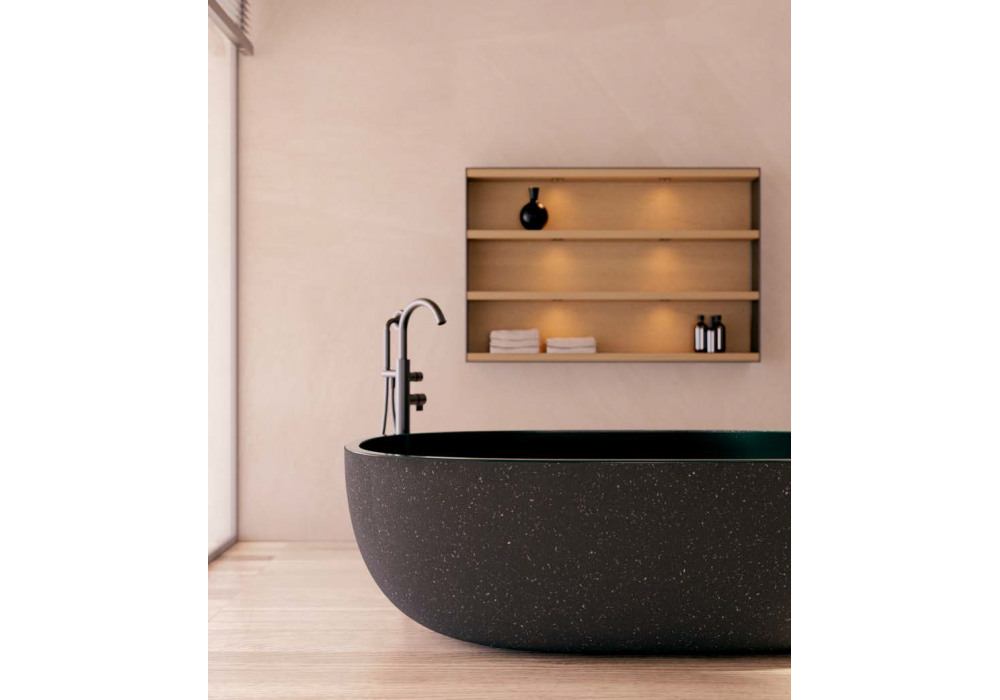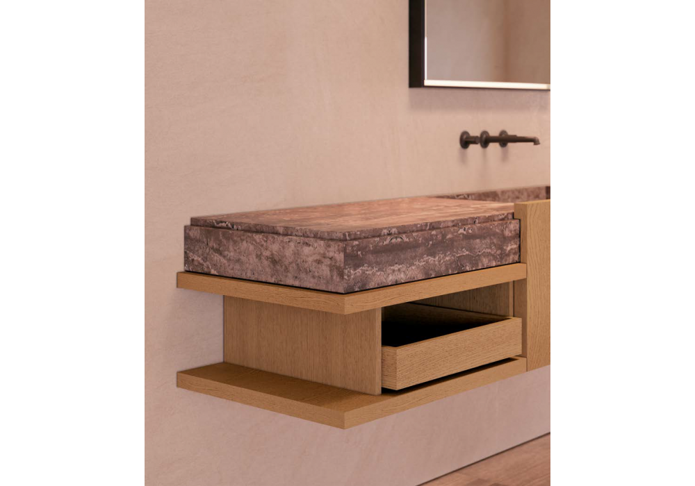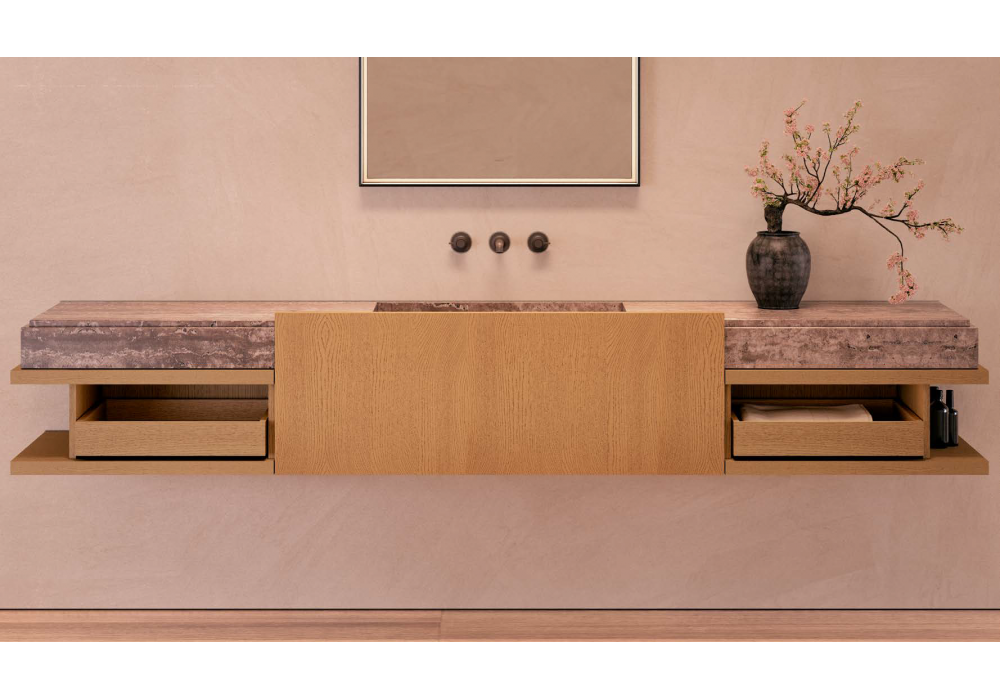 Framis diseñado por Vincent Van Duysen para Molteni&C es un sistema de baño contemporáneo que incluye la bañera Ero, con exterior de piedra volcánica e interior de esmalte verde. La zona del lavabo cuenta con un mueble bajo Framis en roble ámbar, abierto por ambos lados, con encimera de travertino Titan y lavabo integrado. Sobre la bañera, un armario Orthal de 120 cm en roble ámbar con estantes abiertos ofrece un práctico espacio de almacenamiento. El espejo Eidon retroiluminado, la grifería Flora, la mesa de centro Fonte y los bancos Tibeau completan el espacio, creando un conjunto armonioso y sofisticado.