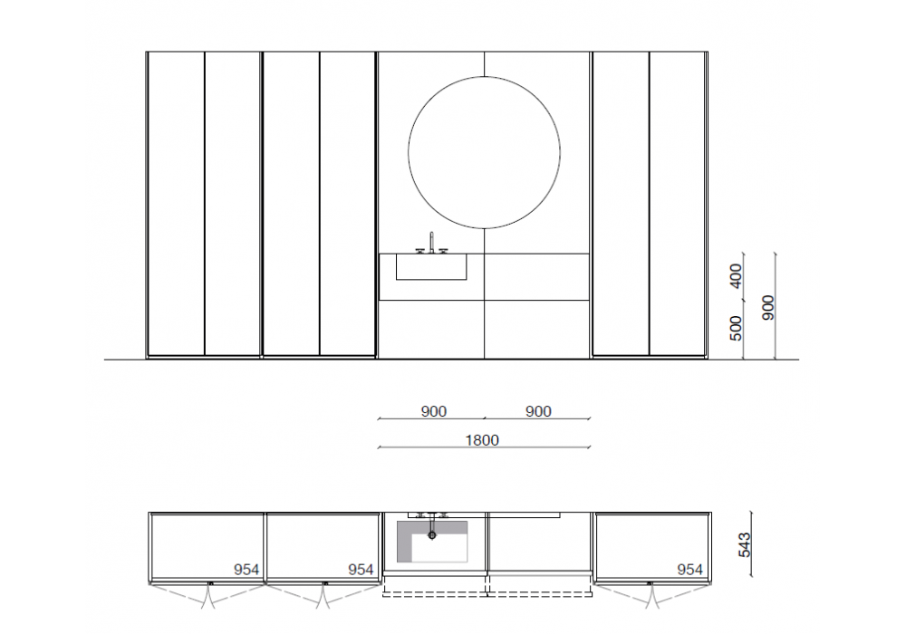 Framis diseñado por Vincent Van Duysen para Molteni&C es un sistema de baño contemporáneo donde el lavabo Framis se integra con el armario Gliss Master, creando un vestidor completo y funcional. La base suspendida en laca capuchino mate se combina con una encimera de travertino Titan con lavabo integrado, mientras que el espejo redondo retroiluminado aporta equilibrio y sofisticación al espacio. La grifería Flora y los acabados refinados completan la composición, ideal para suites, hoteles y residencias de prestigio.