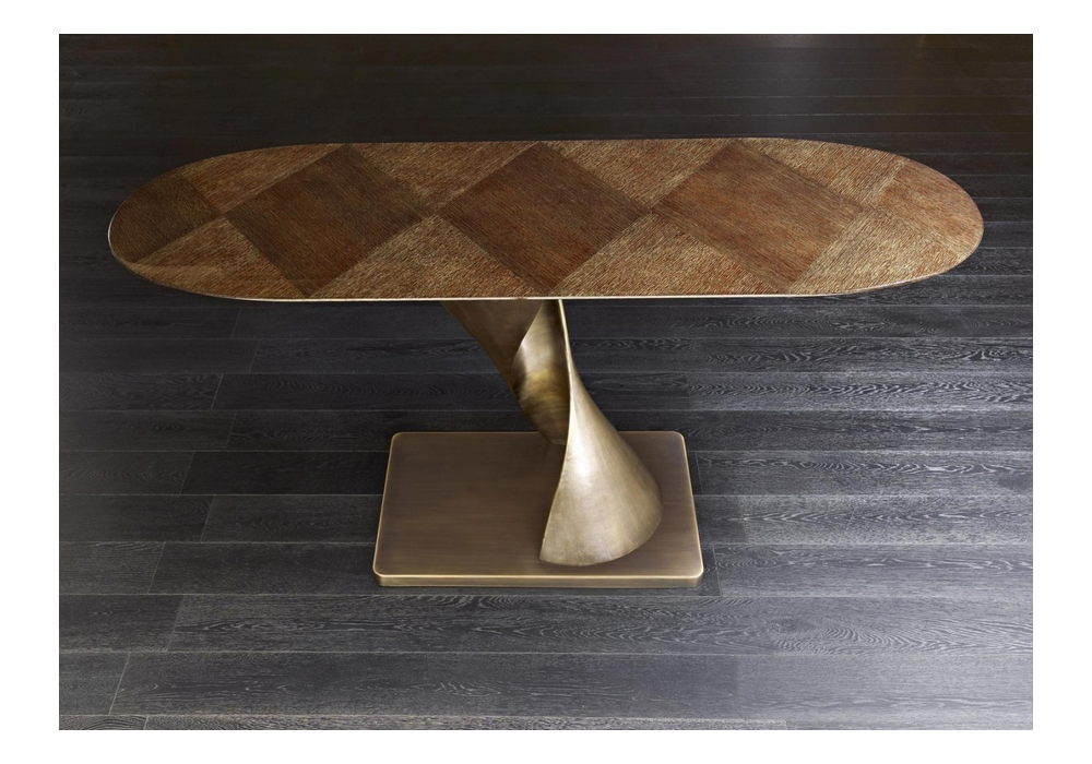 Zoe diseñada por Rugiano es una consola con sobre disponible en cuero, mármol, ébano o decorado y base en latón bronceado.