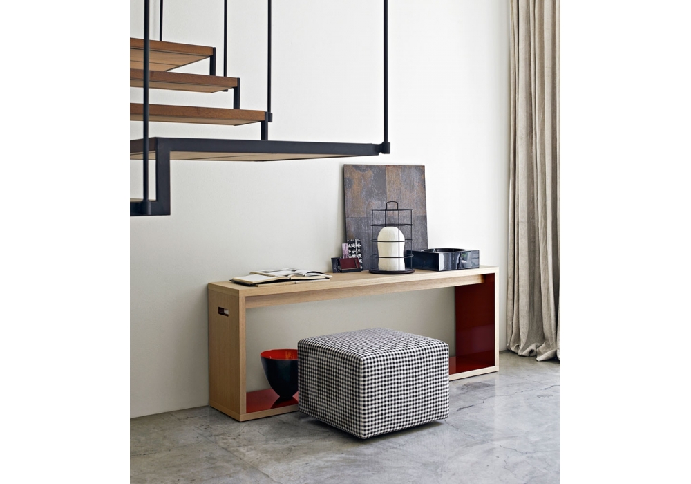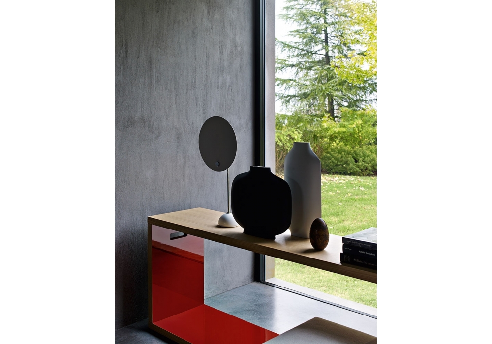 Frank '12 diseñada por Antonio Citterio para B&B Italia es una consola con estructura en tablero de partículas de madera chapada en roble y puntas regulables en acero y material plástico. Acabado interior en diferentes colores lacados brillantes.