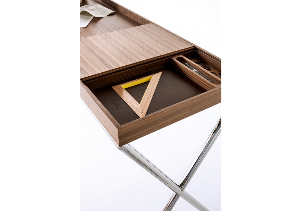 Novel diseñada por Christophe Pillet para Lema es una consola con la parte superior en nogal canaletto y la estructura de metal cromado.
