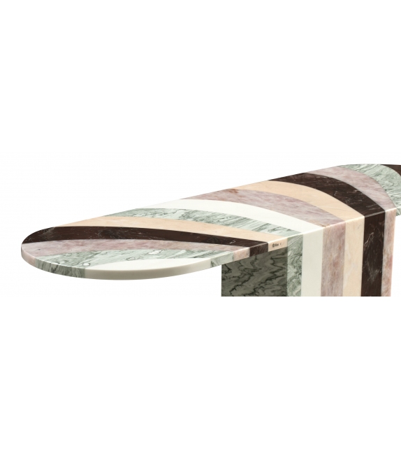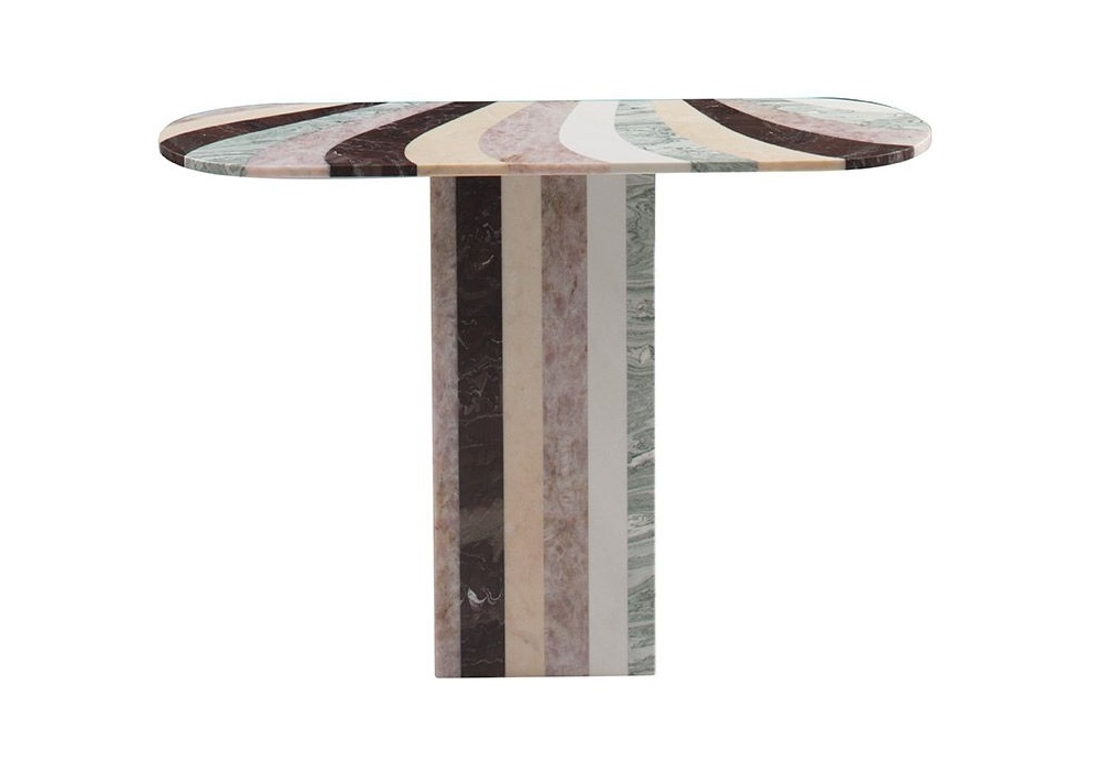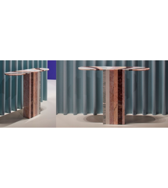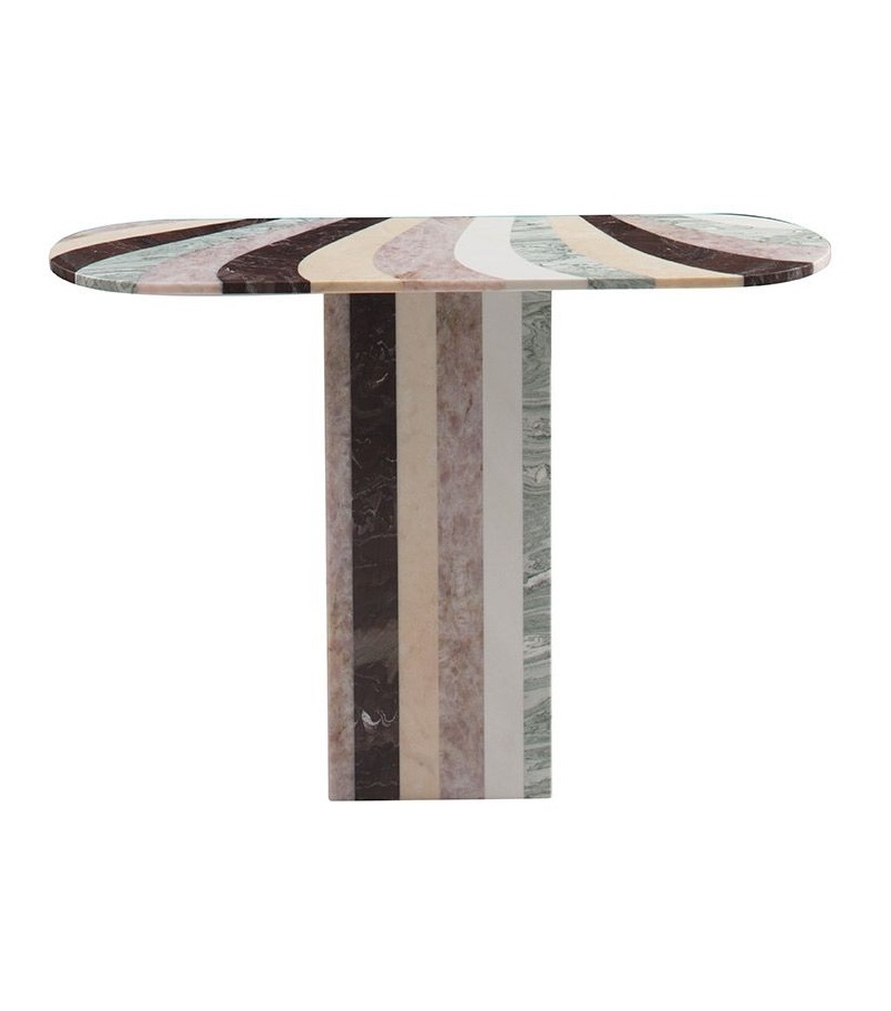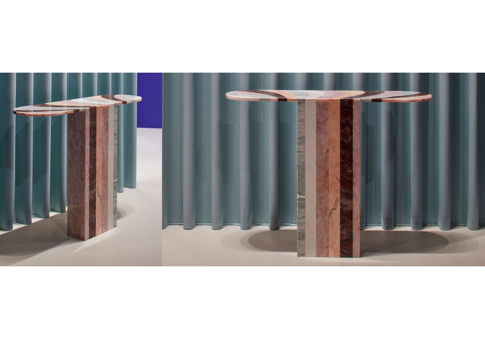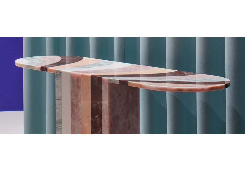 Marea diseñada por Patricia Urquiola para Budri es una consola realizada con incrustaciones artísticas de preciosos mármoles en tonos de color rosa.