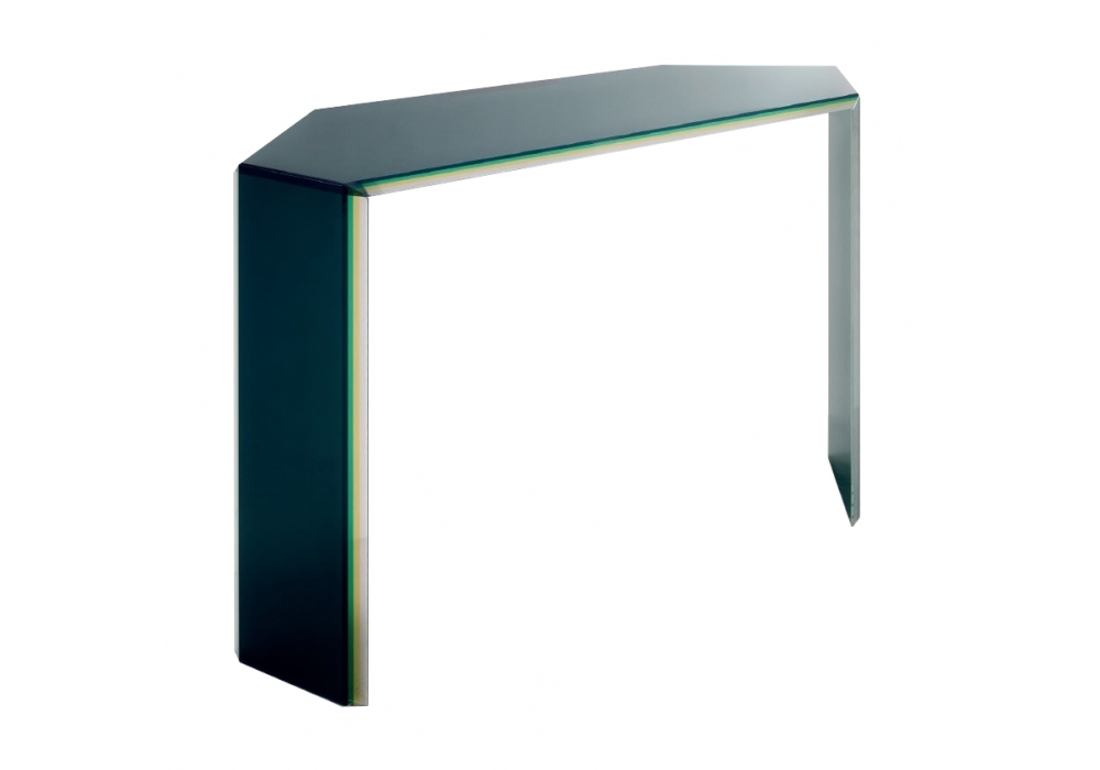 Bisel diseñada por Patricia Urquiola para Glas Italia es una consola realizada en vidrio multilaminado y multicromático, mediante la estratificación de cinco placas de vidrio extralight mm. 5 con películas de diferentes colores.
