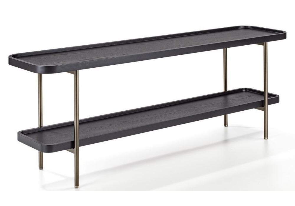 Koster diseñada por Tollgard & Castellani para Porada es una consola realizada con estructura metálica, tablero superior en madera o mármol y tablero inferior en madera. Pies en latón bronceado cepillado.