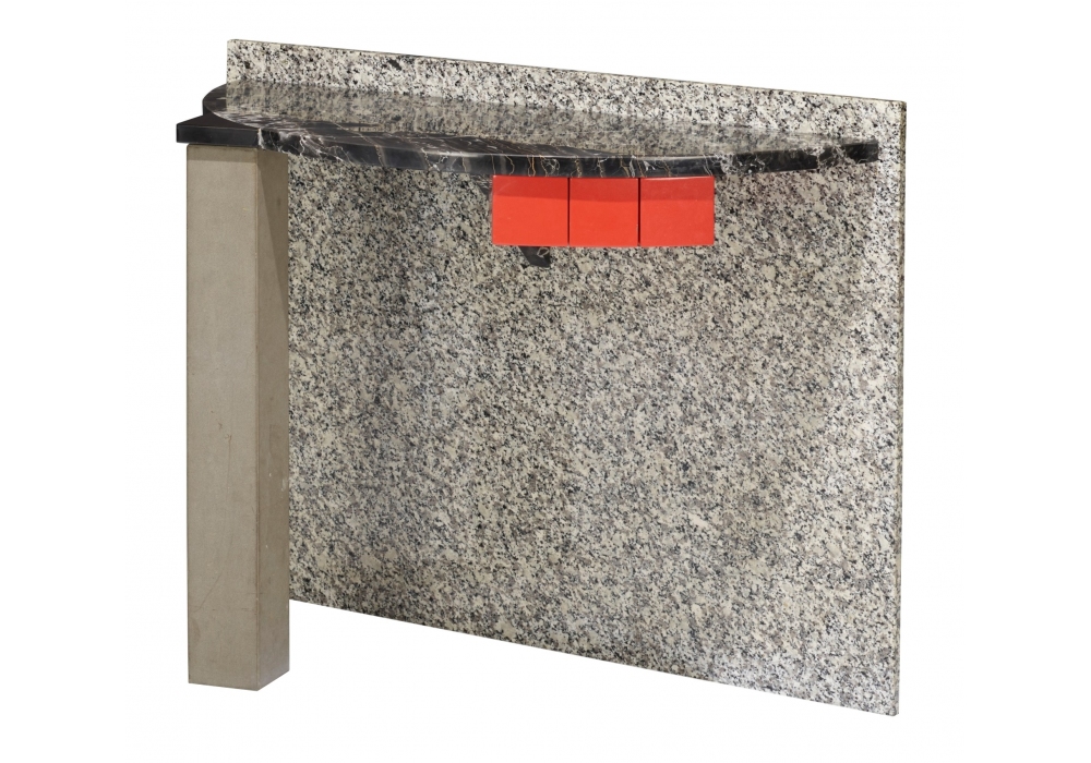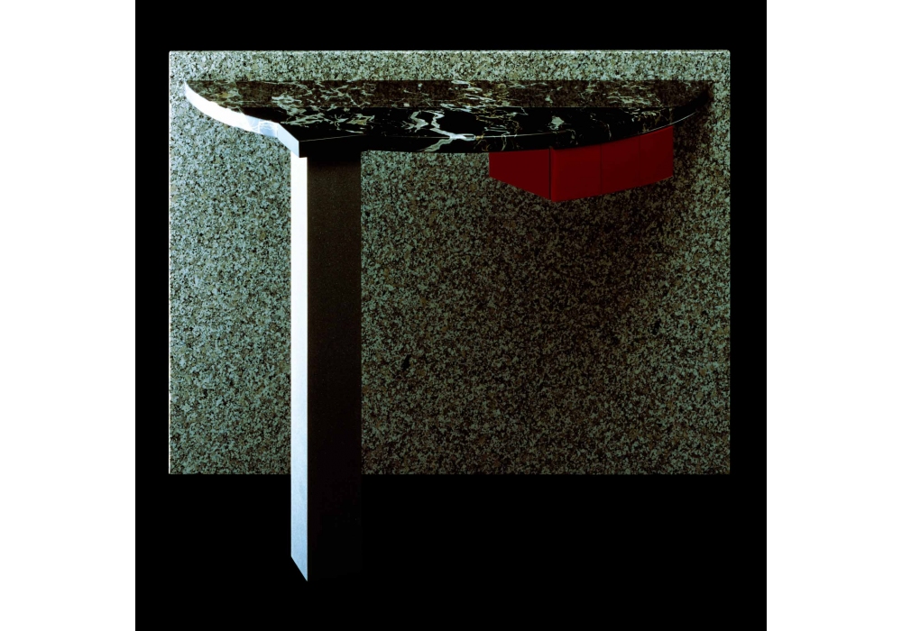Belvedere diseñada por Aldo Cibic para Memphis Milano es una consola realizada en mármol, granito, pietra serena y tres cajones en madera lacada.