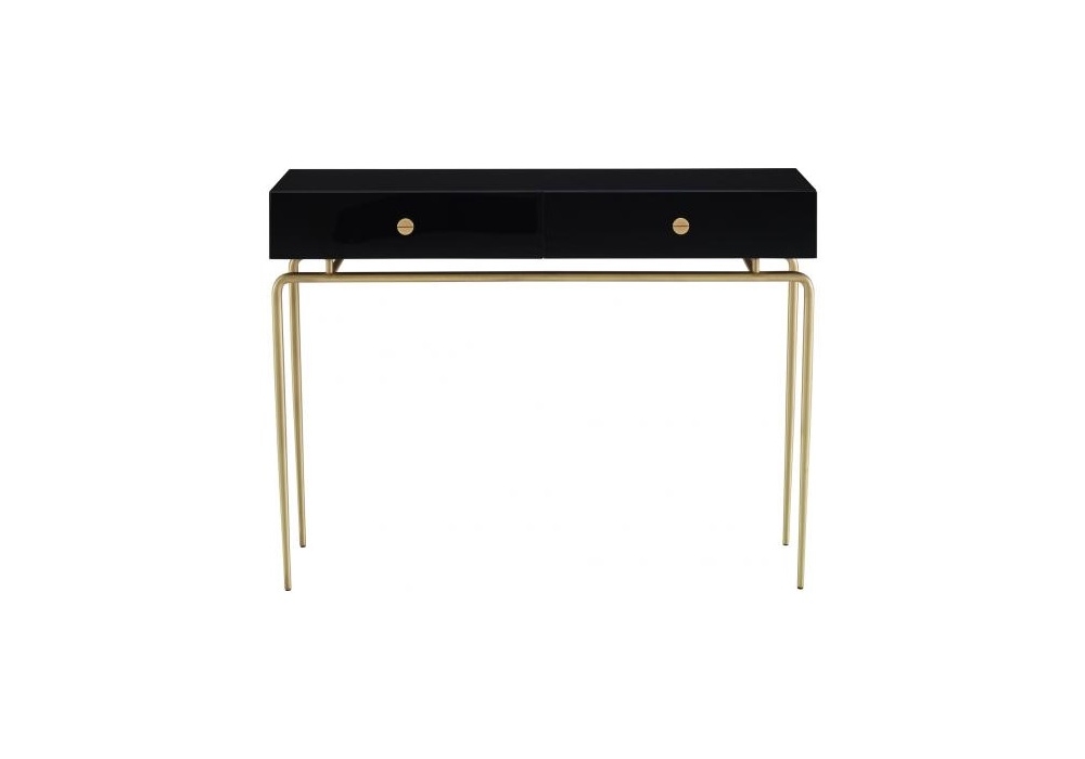 Débourgeoisée diseñada por Desjeux Delaye para Ligne Roset es una consola con base y tirador en acero revestido de latón cepillado mate. Cajones en MDF lacado negro brillo sobre guías invisibles, equipados con cierre controlado.