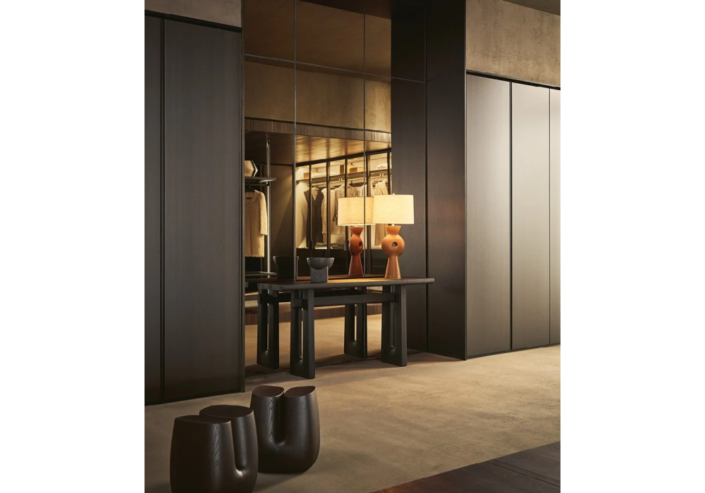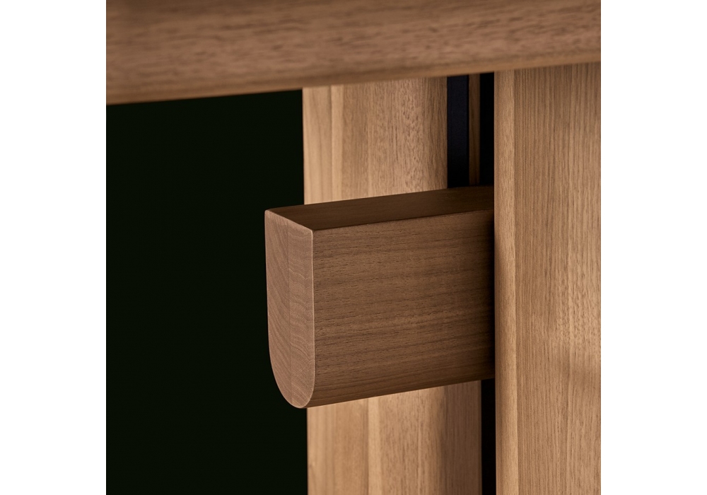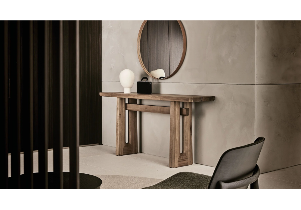 Nara diseñada por Jean-Marie Massaud para Poliform es una consola realizada íntegramente en madera, disponible en olmo negro o nogal o en tablero de fibra de densidad media lacado brillante.