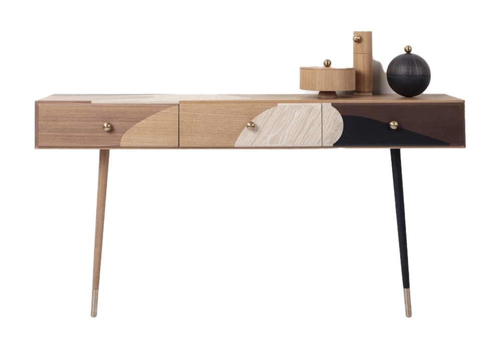 Selavy Marquetry diseñada por Thomas Dariel para Maison Dada es una consola con tablero de forma cuadrangular estructurado en MDF chapado e incrustaciones de fresno. Patas de metal con recubrimiento de polvo negro con puntas de metal. Todas las partes metálicas están calmadas en champán brillante.