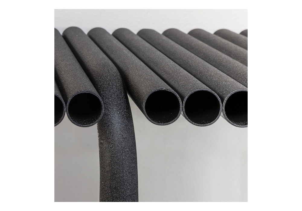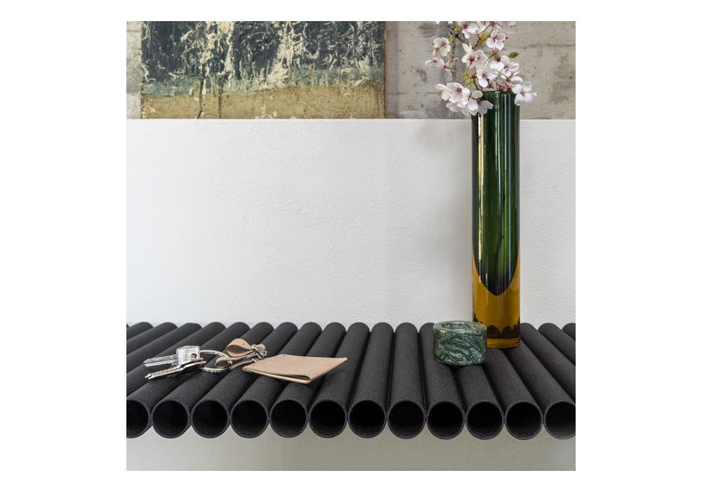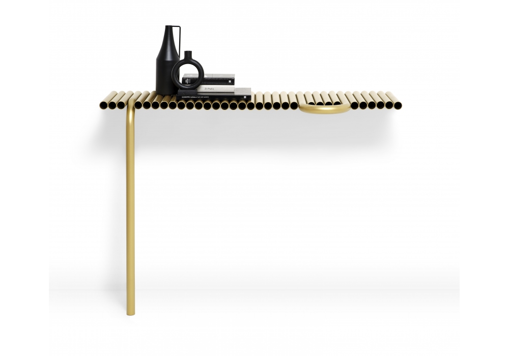 Pipelines diseñada por Bcxsy para Mogg es una consola de metal disponible pintada en oro o negro texturizado RAL 9017. Requiere montaje en pared.