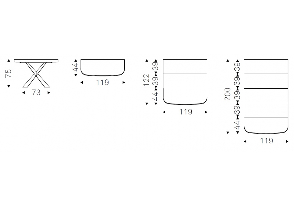 | Dimensiones | 119 x 44 x H 75 cm; 119 x 44→122 x H 75 cm; 119 x 44→200 x H 75 cm. |