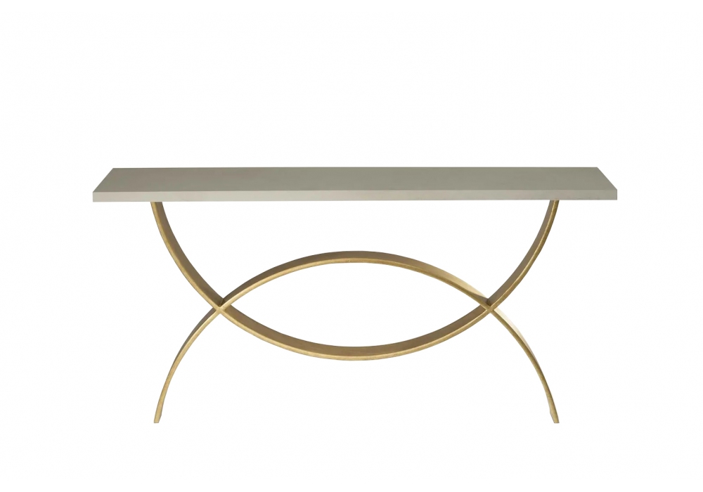 Fishtail diseñada y producida por Porta Romana es una consola cuadrangular con estructura arqueada en acero forjado pintado en diferentes colores. La tapa es de mármol, piedra o madera en diferentes acabados.