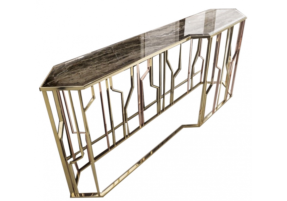Ginza diseñada por Alessandro La Spada para Longhi es una consola con estructura en metal brillante o mate, y tablero en mármol, espejo o revestido en piel. Disponible en diferentes medidas.