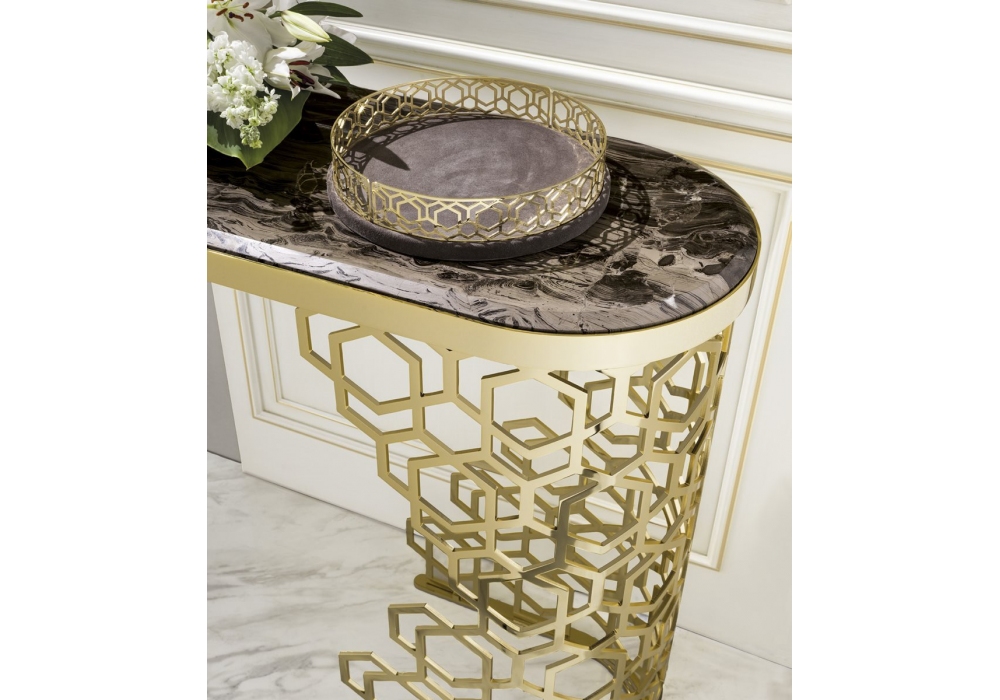 Manfred diseñada por Giuseppe Iasparra para Longhi es una consola con tablero en mármol, espejo o cristal y estructura en metal rectificado cortado con láser con decoración Sequence. Disponible en diferentes dimensiones.