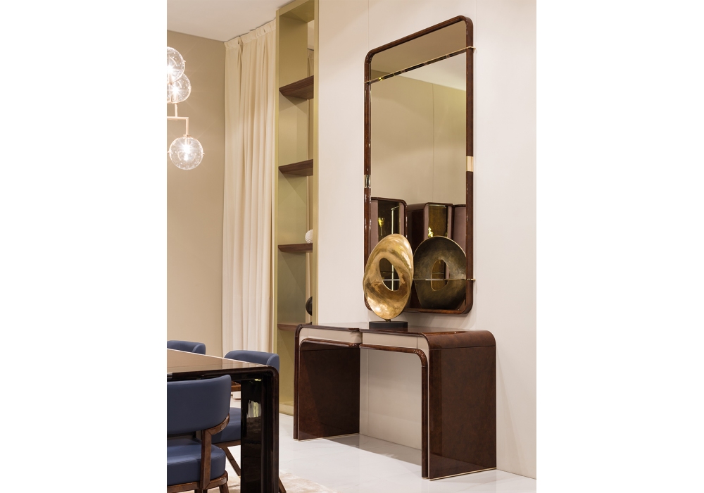 Madison diseñada por Andrea Bonini para Turri es una consola con estructura en MDF y paneles de tablero de partículas en acabado poliéster brillante decorado a mano con inserciones en cuero y detalles en metal dorado. Hay dos cajones con forro de microfibra y aplicaciones de cuero.