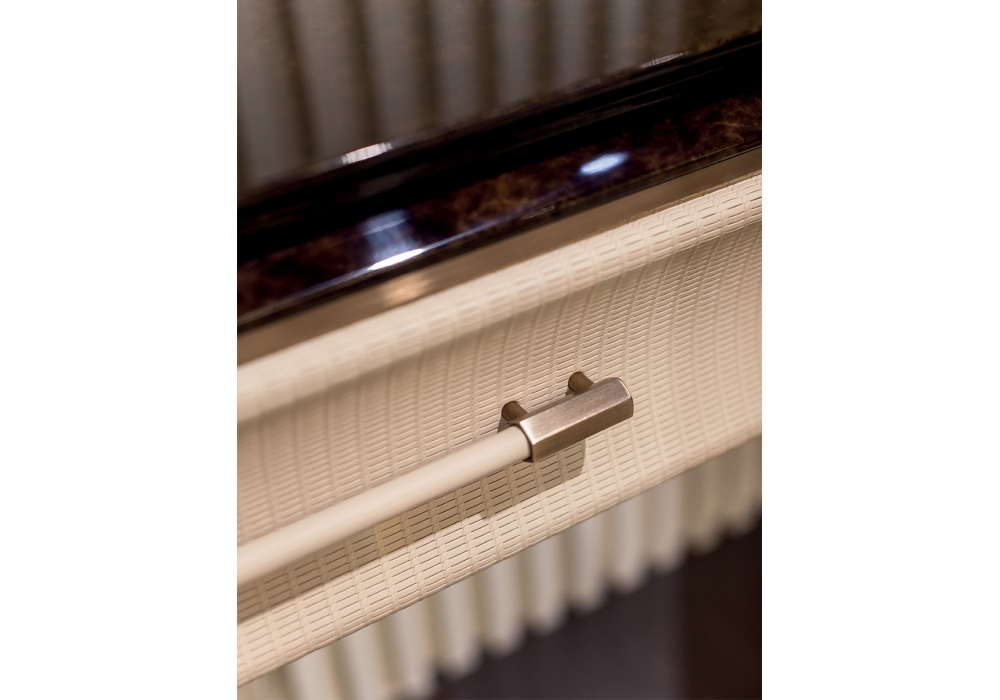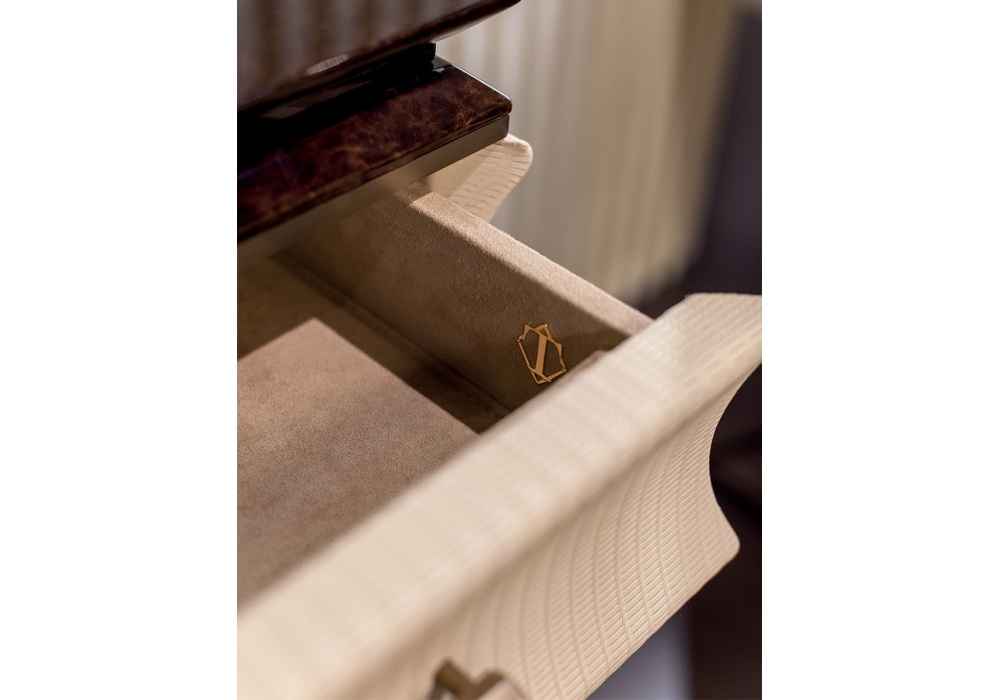 Noir diseñada por Andrea Bonini para Turri es una consola con estructura en MDF y madera maciza, base en acabado poliéster brillante decorado a mano y tablero en madera o mármol. Hay un cajón con revestimiento interno en microfibra y manijas de metal con aplicaciones de cuero.