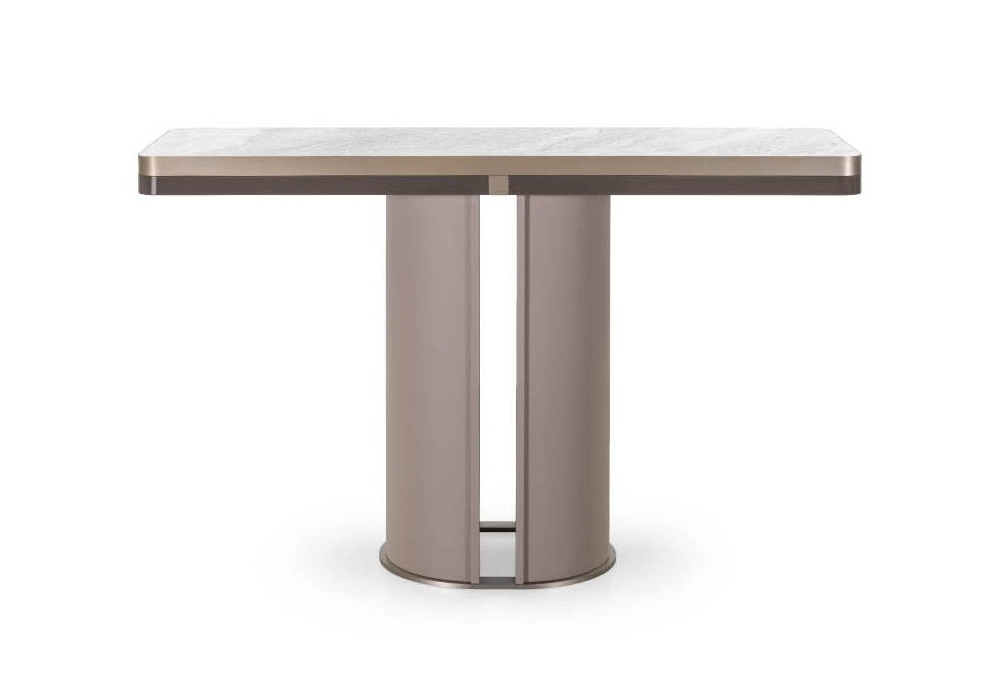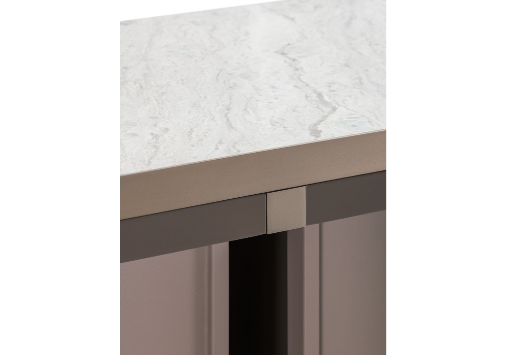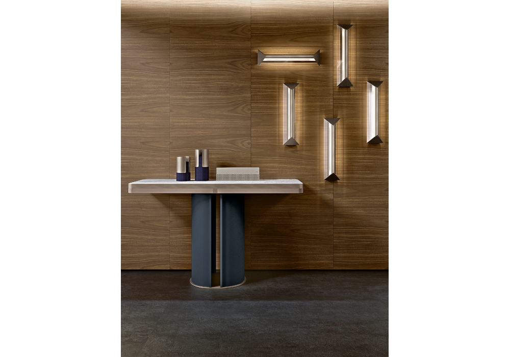 Zero diseñada por Andrea Bonini para Turri es una consola con estructura en MDF y contrachapado revestido en diferentes pieles. Tapa en madera lacada brillo o mármol. Partes metálicas en acabado platino mate oscuro o claro.
