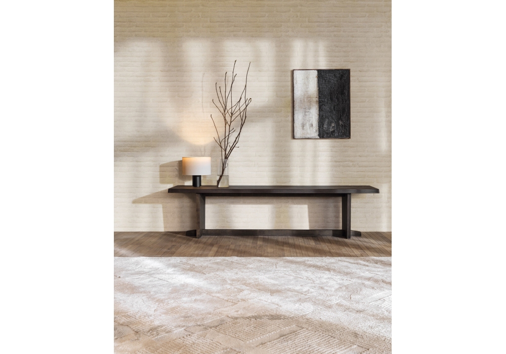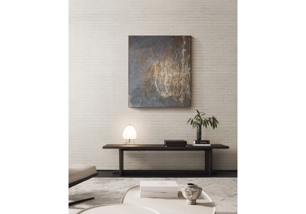 Remi diseñada por Vincent Van Duysen para Molteni&C es una consola realizada con una base en madera maciza de fresno teñida con un perfil inferior en acero pintado color cobre y una superficie superior en tablero de partículas revestido con chapa de fresno y secciones perimetrales en madera maciza. Acabado roble café.