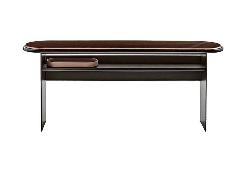 Sensei diseñada por Staffan Tollgard & Filippo Castellani para Gallotti&Radice es una consola con estructura de metal lacado “deep black” y tapa de madera. Apoyado sobre la tapa de madera, tapa de cristal de 12 mm con media punta de toro rectificada en el exclusivo acabado “Rosso Marte” o pintada según muestras en la versión brillante. También disponible con mármol Calacatta Vagli Oro natural pulido de 20 mm, Ceppo di Gré® cepillado, Arabescato Orobico Rosso satinado o Bianco Carrara Gioia cepillado. Versión lounge altura cm 65, disponible bajo pedido. Bandeja de accesorios de metal recubierta de piel fard.