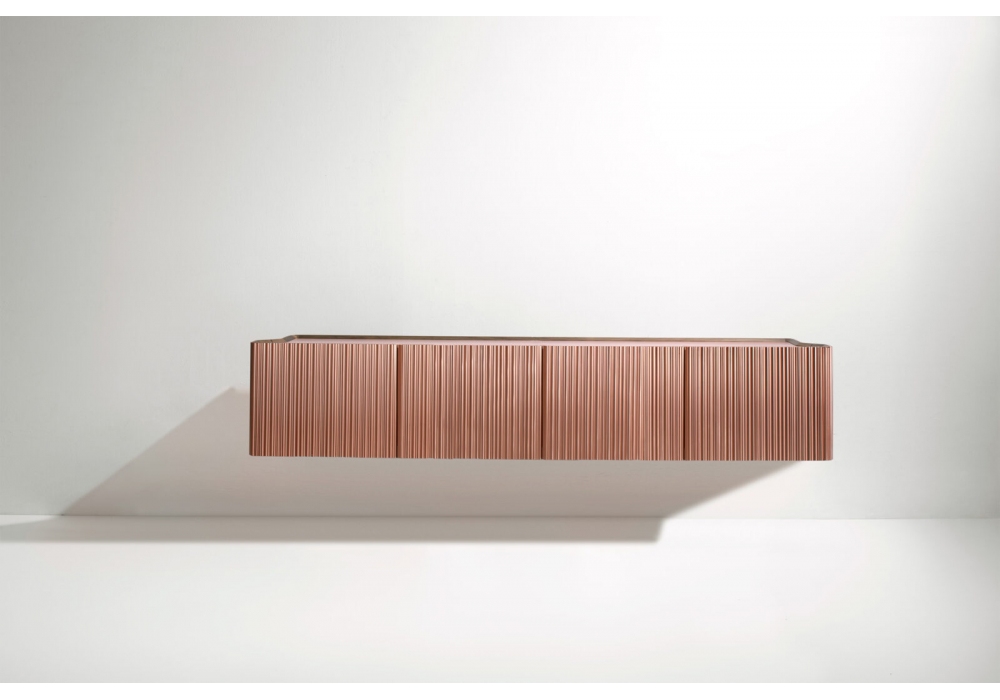 Canneto diseñada por Adriano Design para DeCastelli es una consola realizada en metal con dos cajones y dos puertas laterales. Estructura interna en madera de nogal Canaletto. Disponible en diferentes acabados y en versión de pie o suspendida.
