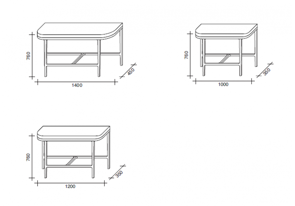 | Dimensiones | - 100 x 35 x H 76 cm; - 120 x 35 x H 76 cm; - 140 x 45 x H 76 cm. |