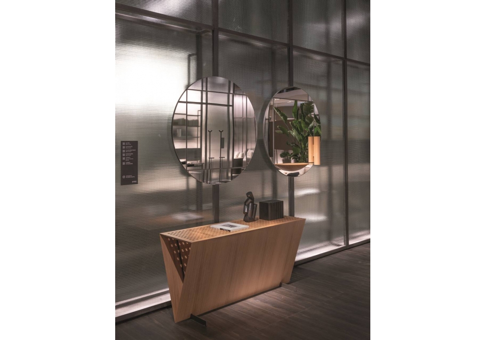 Alvea diseñada por Marco Lavit para Living Divani es una consola triangular con estructura en chapa de acero pintada con polvos epoxi color bruñido, paneles laterales en MDF chapado en roble y tablero compuesto por elementos en roble macizo. Apoyo al suelo garantizado por soportes en material termoplástico.