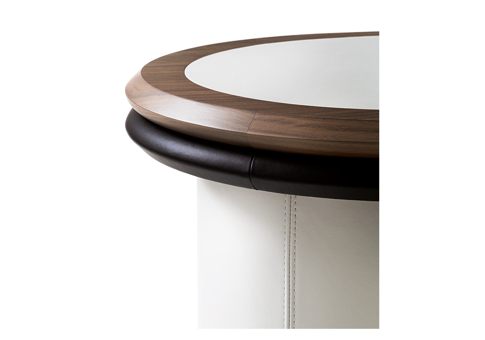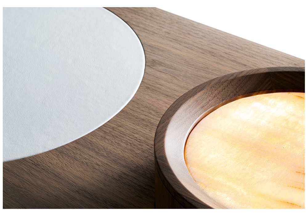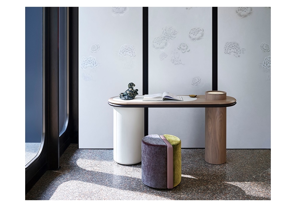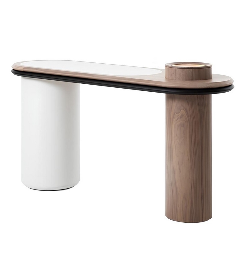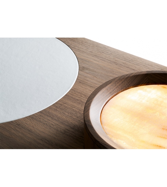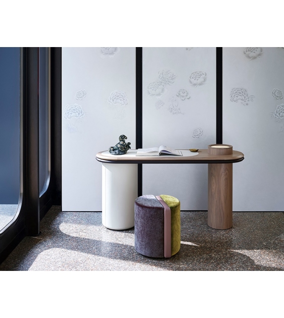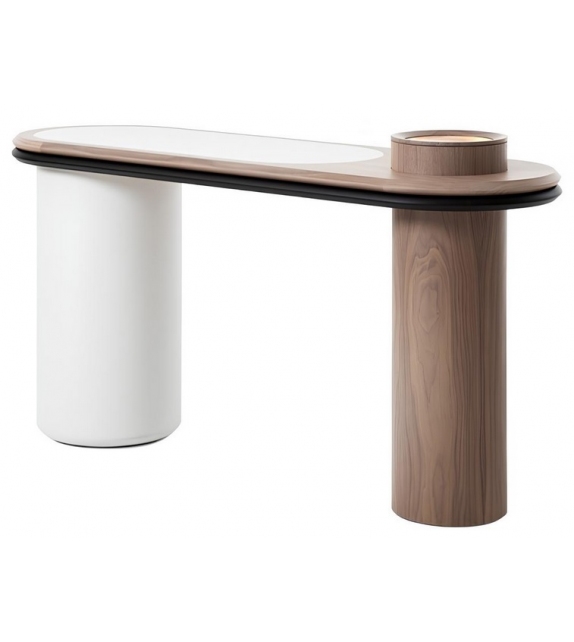 Liz diseñada por Silvia Musetti para Giorgetti es una consola realizada en nogal canaletto y partes revestidas en cuero. Disponible en diferentes acabados y con posibilidad de añadir LED.